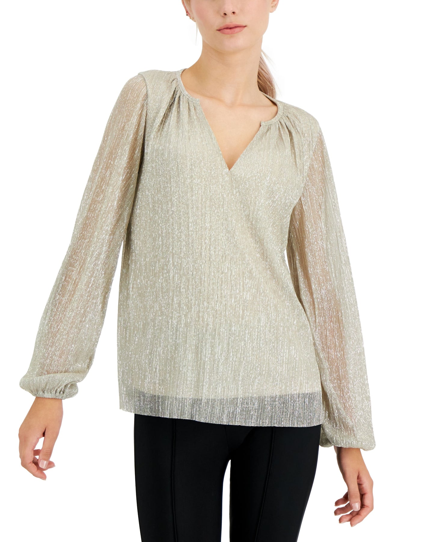 Bring chic shimmer to your day and night looks with this effortless petite top from Alfani. Approx. 22-3/4" long Designed to fit and flatter 5'4" and under frame Split neckline; ruched along neckline Metallic detail Long peasant sleeves; cinched cuffs Shell: polyester/metallic fibers; lining: polyester Machine washable Imported