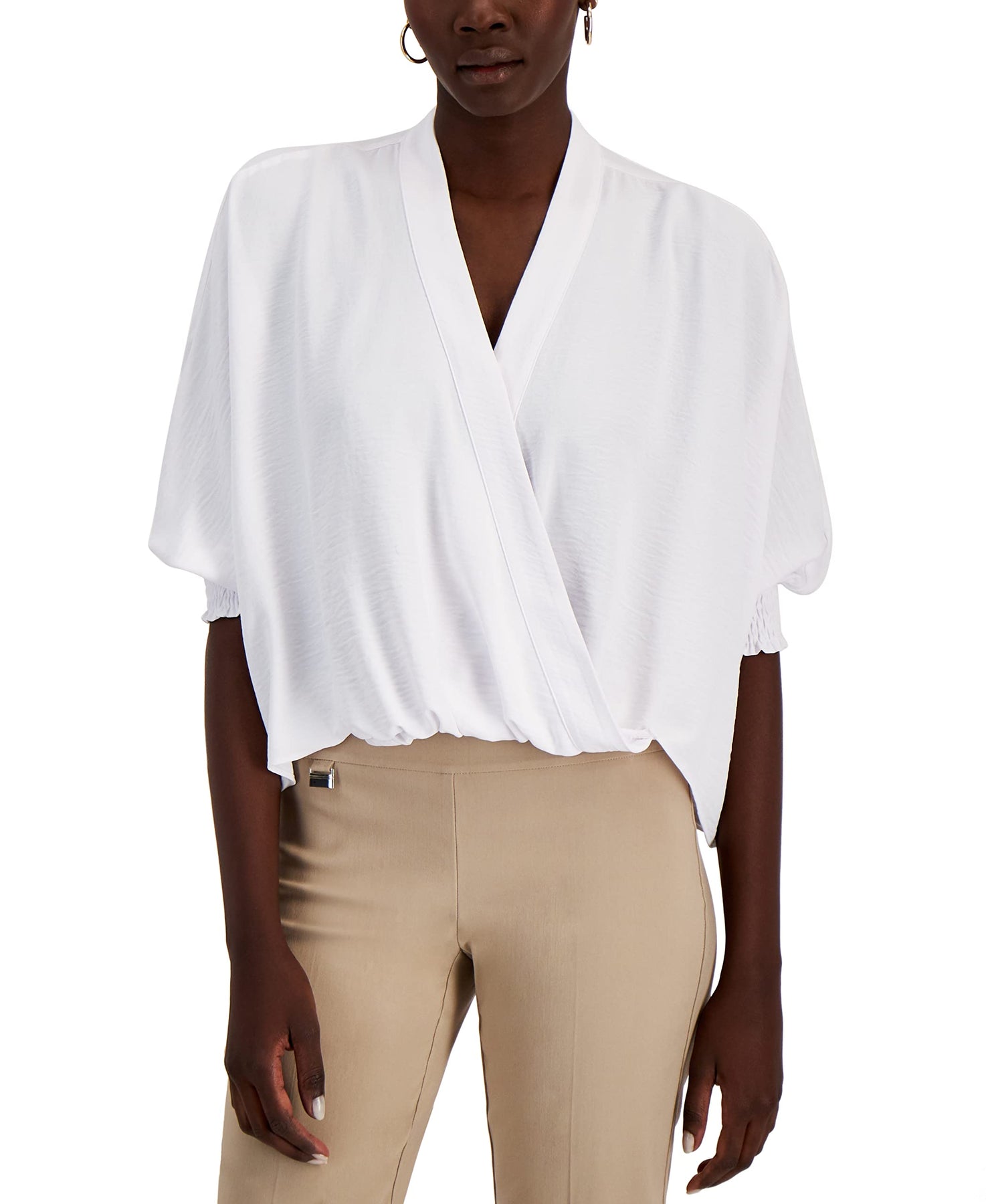 Alfani's petite surplice-neck blouse is easy to dress up or down, depending on your mood. Approx. length: 19-3/8" Designed to fit and flatter 5'4" and under frame Surplice V-neck 3/4-Dolman sleeves with smocked cuffs Polyester Machine washable Imported Web ID: 13396999