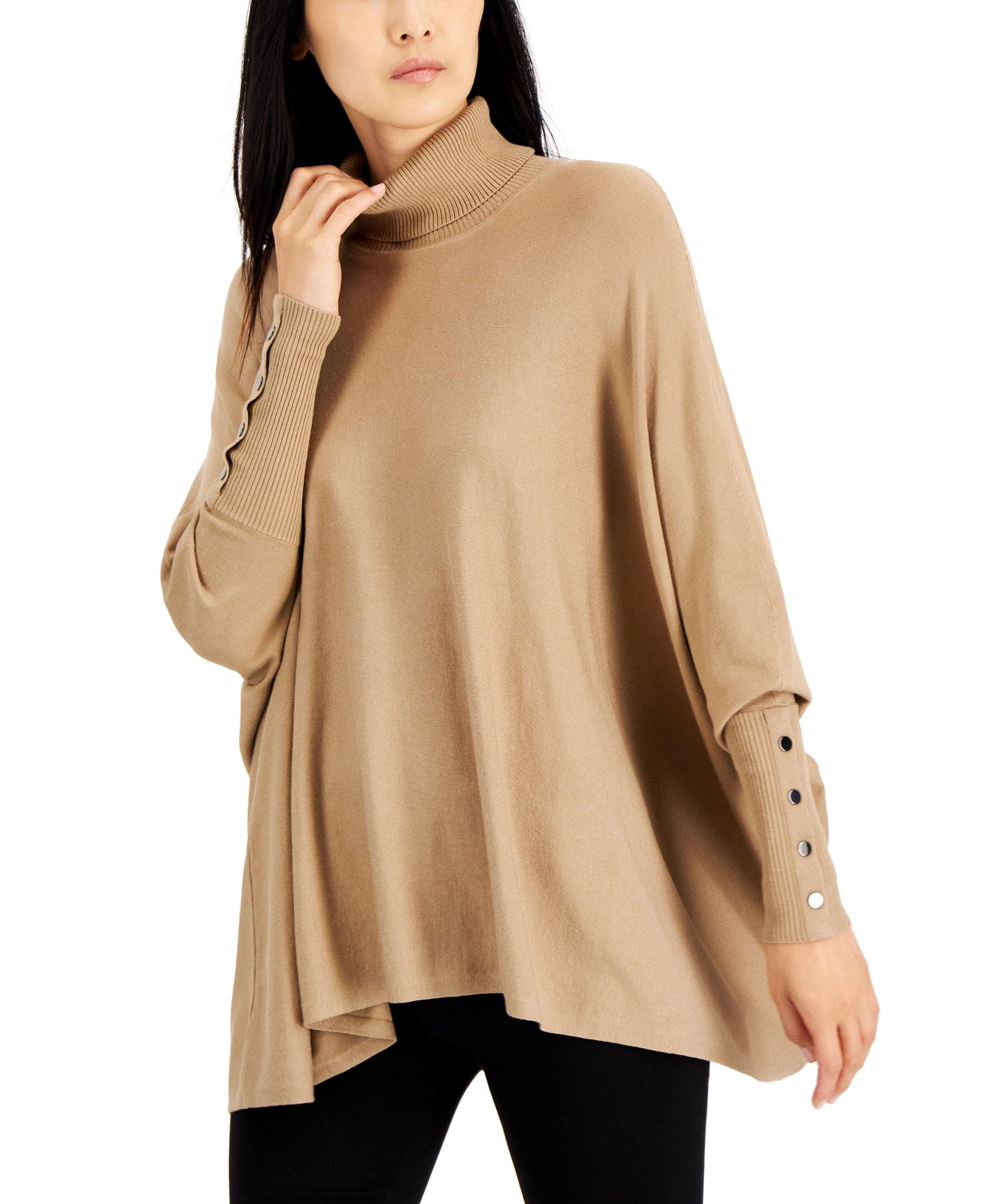 Embrace dramatic elegance and sophistication with Alfani's cozy petite turtleneck sweater. The voluminous poncho silhouette is beautifully balanced with slim ribbed cuffs for a chic look. Designed to fit and flatter 5'4" and under frame Turtleneck Ribbed cuffs with button trim; handkerchief hem Long dolman sleeves Poncho fit Hits below hips Styles are tailored for the petite customer, hits and fits at the right places specifically at wrist and ankle This product was made in a factory where RISE programs advance women's empowerment and gender equality Rayon/nylon Machine washable Imported