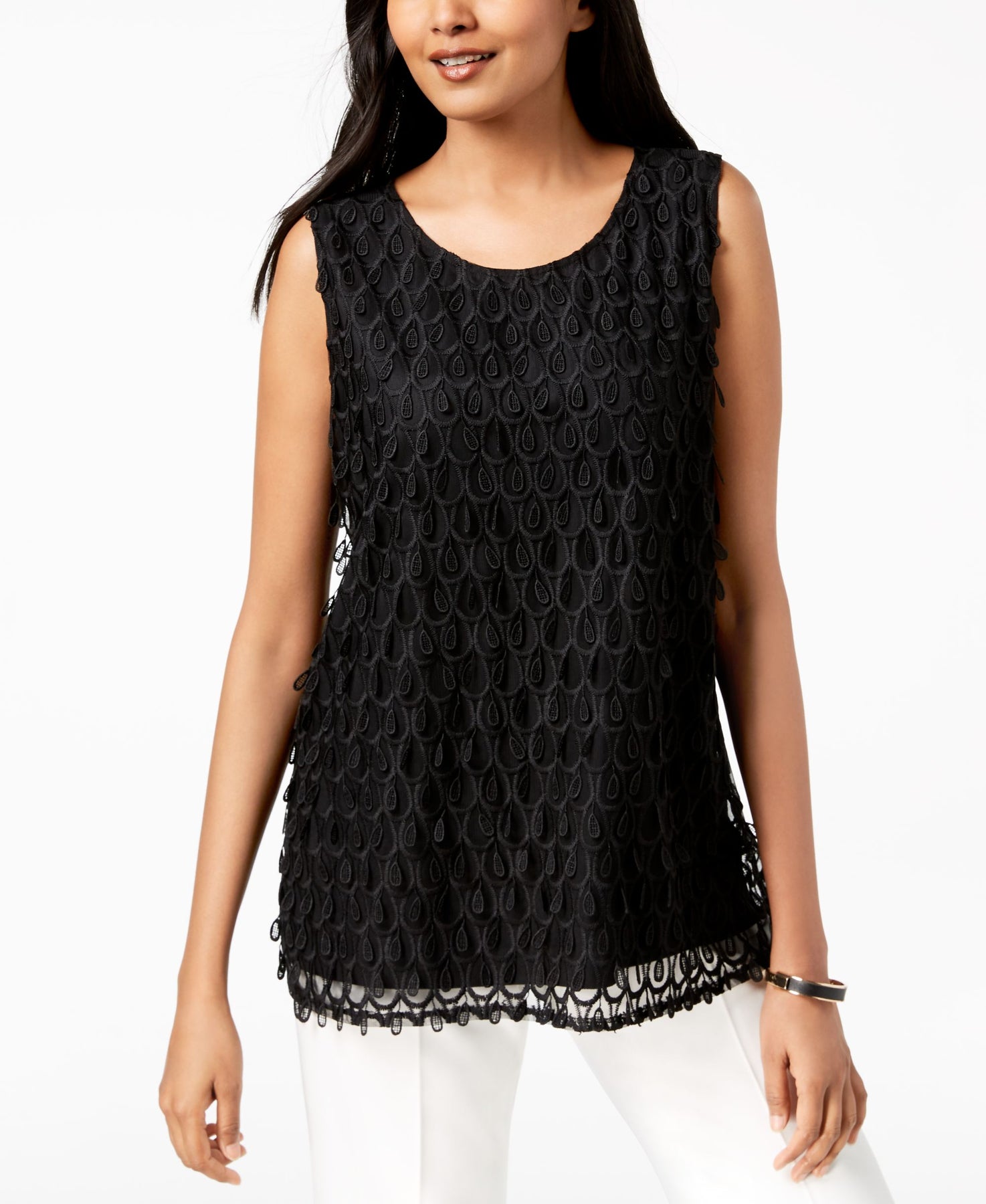 Alfani's sleeveless shell features appealing texture, thanks to an embroidered teardrop-style tasseled fabric. Scoop neckline Textured, 3D embroidered details at front Easy fit; hits at hip Polyester Machine washable Imported
