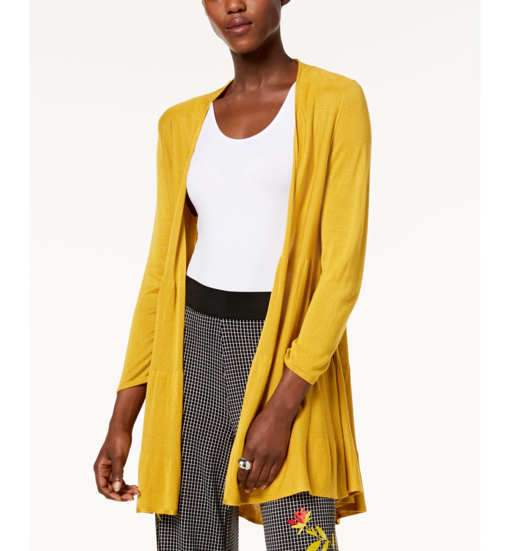 Give your look a playful finish with this flowing cardigan from Alfani, styled with a clever open front and tiered design. Approx. model height is 5'10" and she is wearing a size small Hits below hip Open front Tiered design at bodice 3/4-sleeves Rayon Machine washable Imported