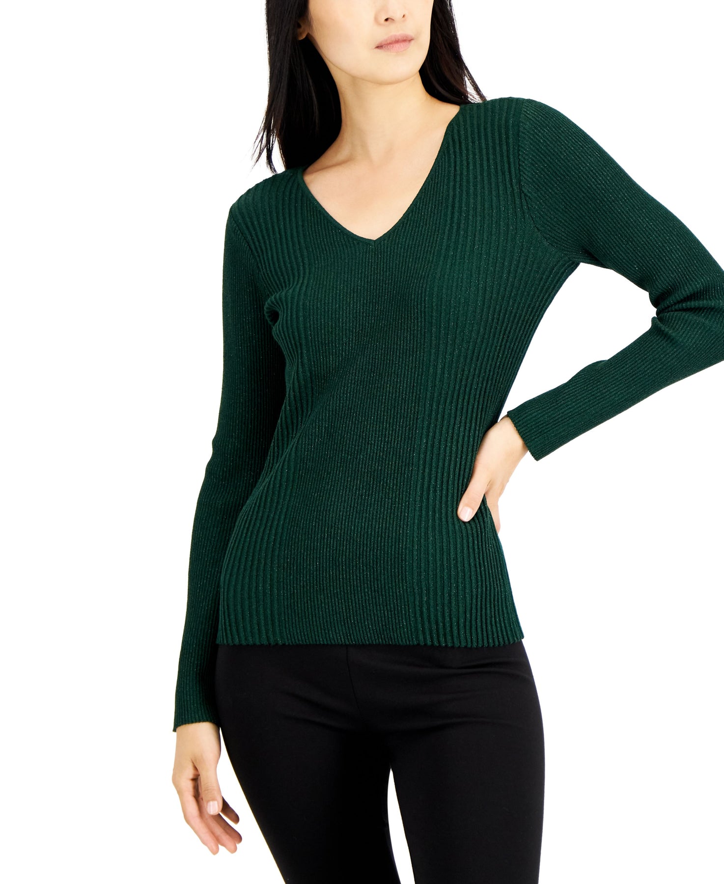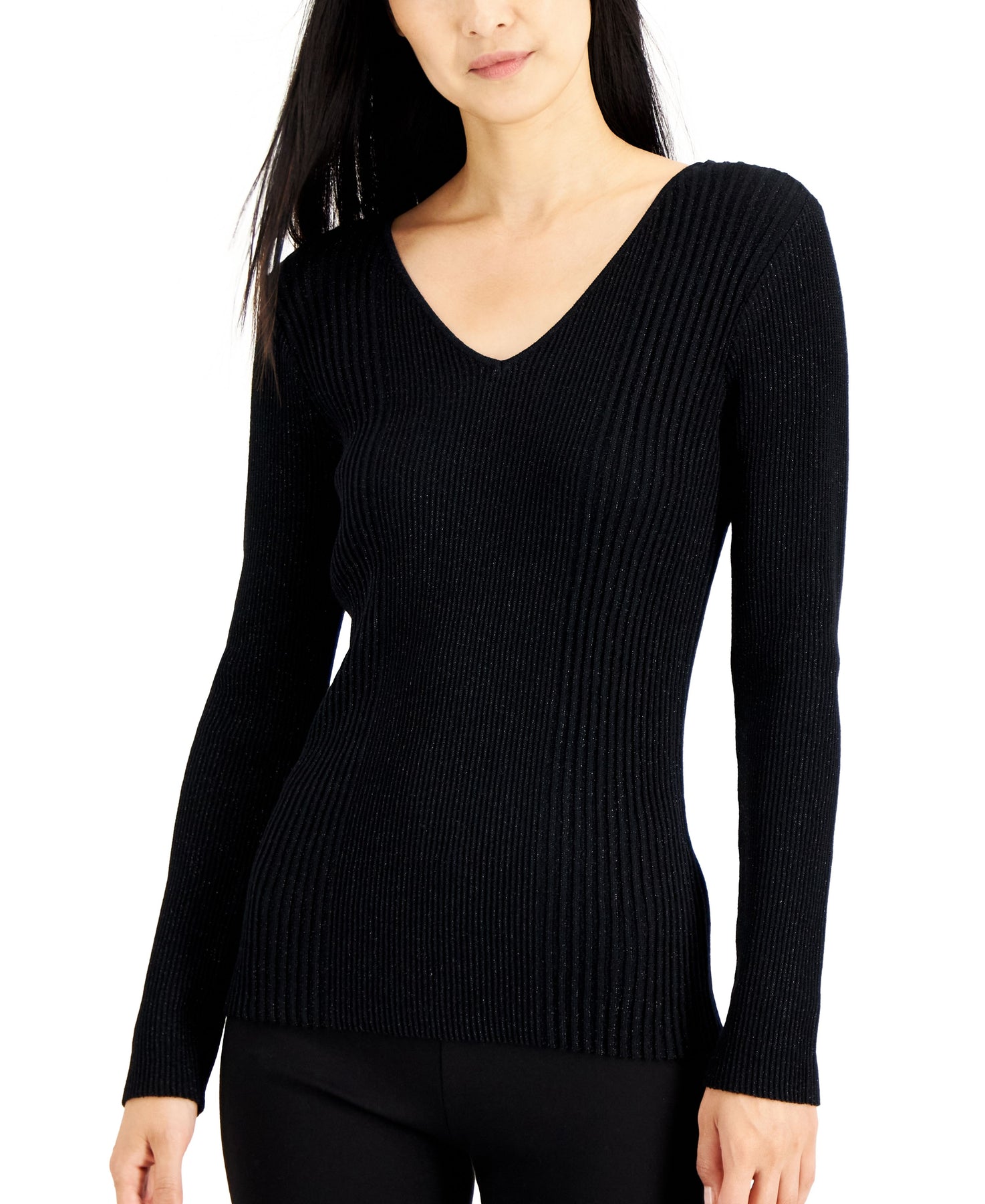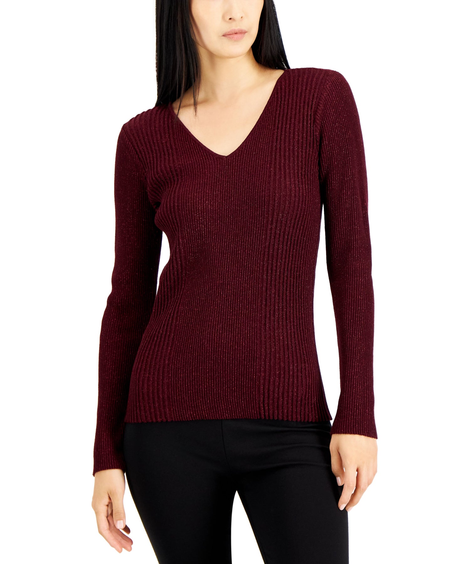 Alfani Womens Metallic Ribbed V Neck Sweater