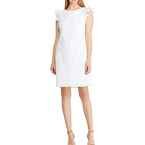 American Living's breezy day dress features lightweight eyelet embroidery and playful flutter cap sleeves. A delicate scalloped hem lends beautiful dimension to this warm-weather look. Approx. model height is 5'10" and she is wearing a size 2 Approx. 36" long from center back neck. Length is based on size 8 and varies 1/4" between sizes Slim fit Rounded neckline Concealed center back zipper with a hook-and-eye closure Ruffled cap sleeves Scalloped hem Bust darts Fully lined Shell: cotton/polyester; lining: polyester Machine washable Imported
