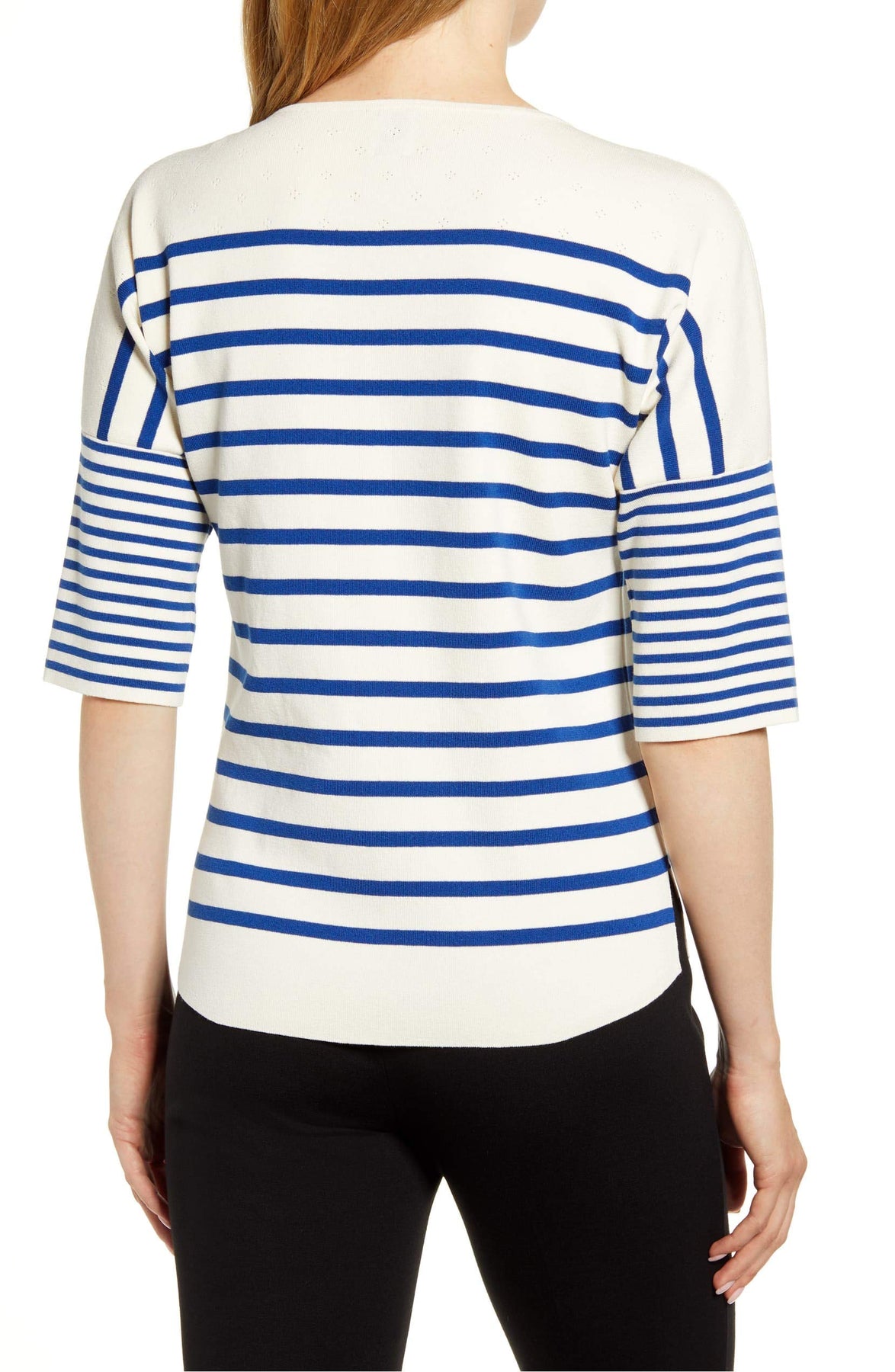 The elegant boat-neck silhouette of this Anne Klein sweater features elbow-length sleeves, so you can take this look through the seasons. Pointelle details and a chic striped pattern make for a piece we can't get over. Hits at hip Boat neckline Pointelle detail at front and back yokes Elbow-length sleeves Polyester/rayon Dry clean Imported