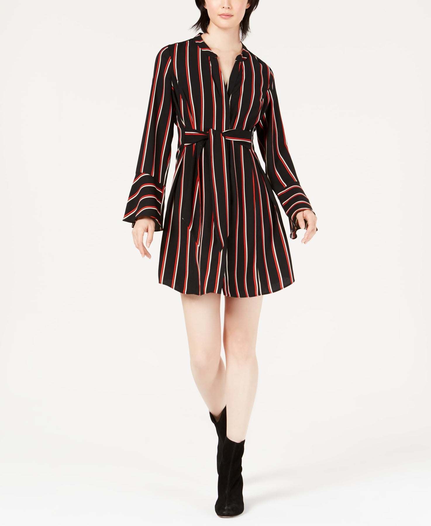Add dimension to your weekday style in this striped A-line dress by Bar III with a chic tie belt at the waist. Band collar with split neckline; A-line silhouette Hidden stay-put closures Tie at front waist Unlined Polyester/spandex Machine washable Imported