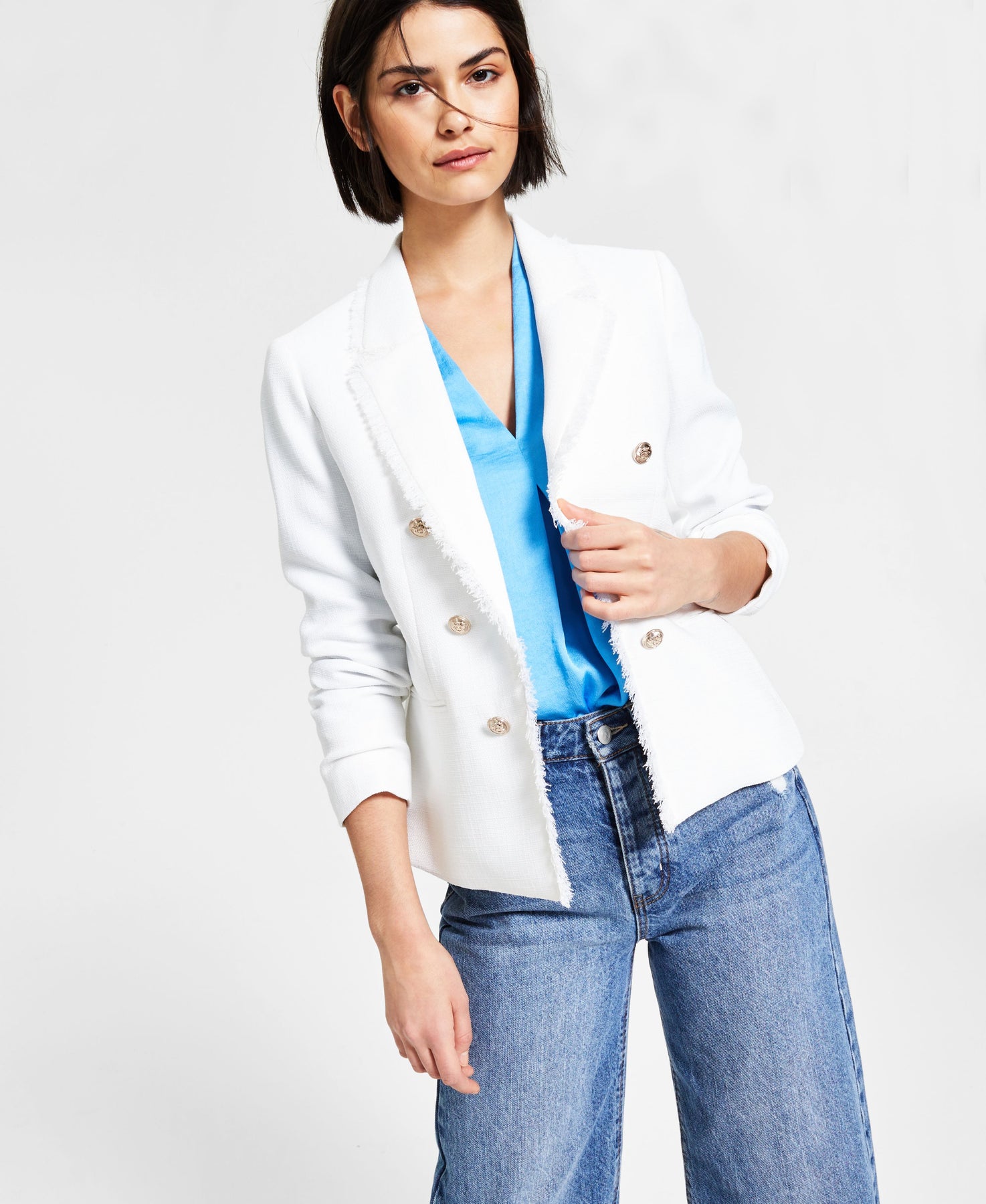 Layer on trending style with this tweed jacket from Bar III. Approx. 23" long Notched collar; open front Shoulder padding; decorative buttons at front Side welt pockets Lined Shell: polyester/elastane; lining: polyester Dry clean Imported