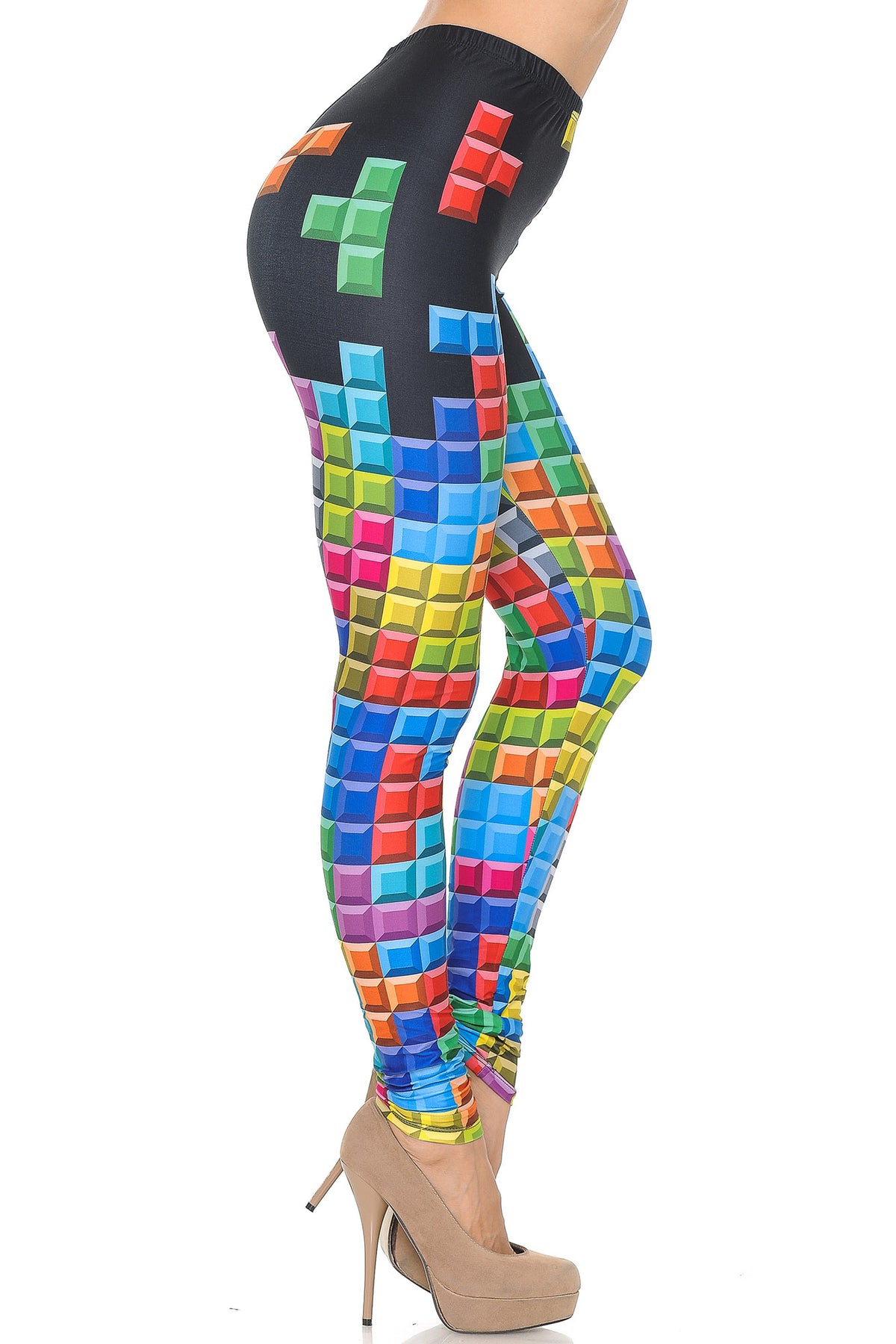 Game over! Our Creamy Soft Tetris Leggings are the clear winner among the rest when it comes to fashion. Featuring bold colored blocks that contrast the black background, these retro gaming themed leggings are sure to liven up your outfit.