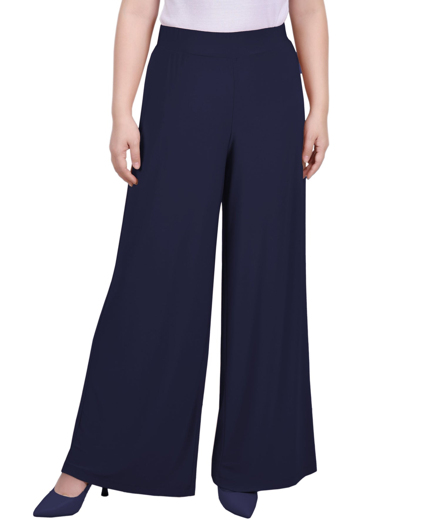 These palazzo pants from NY Collection are as comfortable as they are stylish, featuring a streamlined silhouette. Mid rise: approx. 8-1/4 inches Approximate short inseam 28 inches Elastic waist; pull-on style Relaxed fit through hips and thighs Soft jersey knit Petite sizes are designed to fit and flatter 5'4" and under frame Polyester, Spandex Machine Washable Imported Web ID: 15096992
