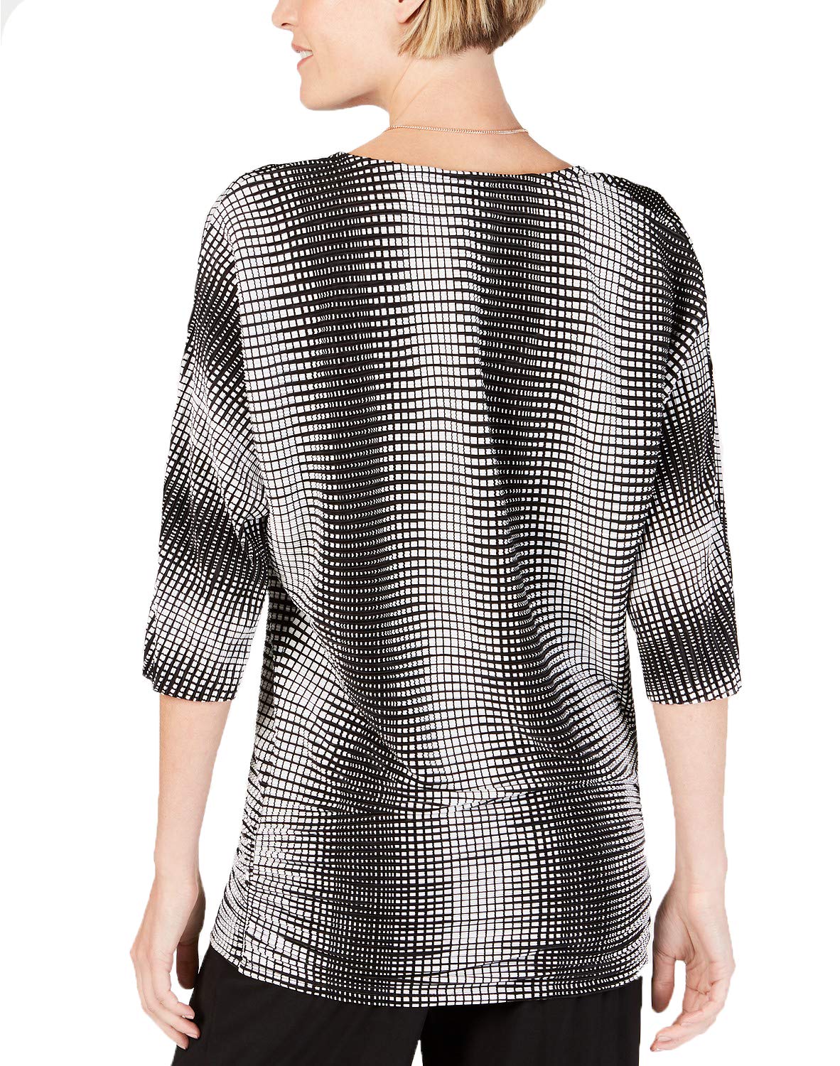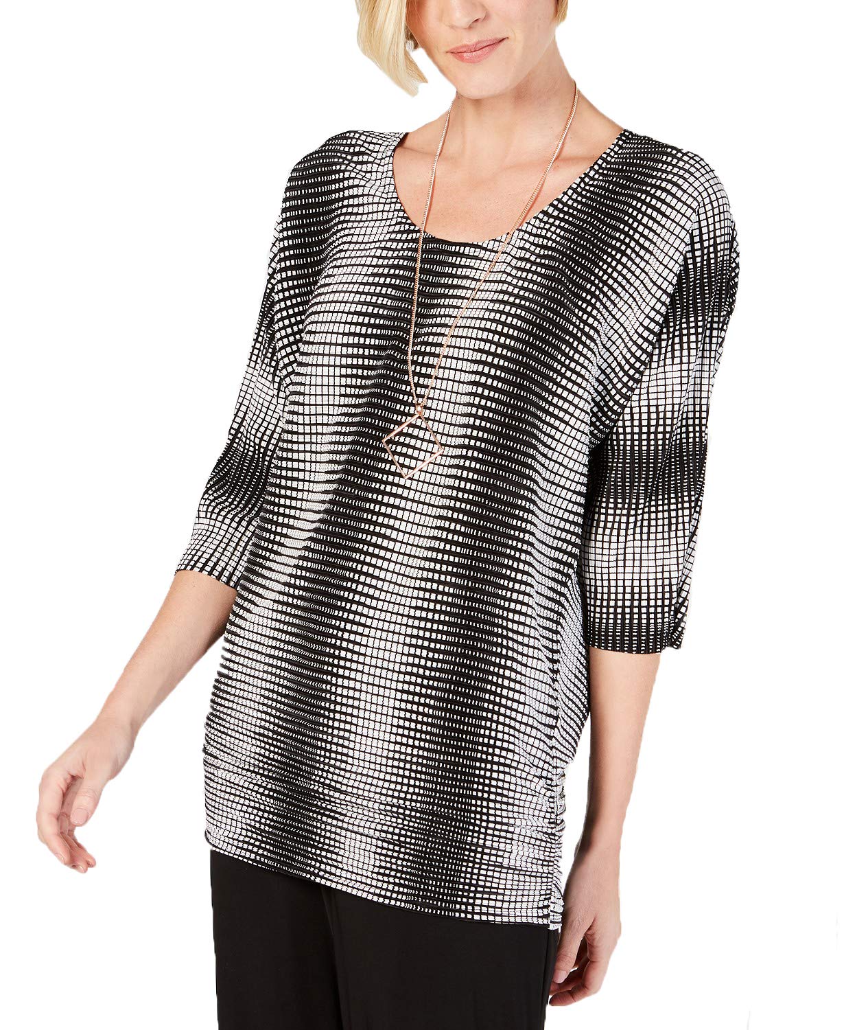 Accented by a geometric necklace and hip-skimming ruching, this JM Collection top's printed bodre fabric forms a smooth drapey finish. Approx. model height is 5'10" and she is wearing a size small Relaxed fit; hits at hip; approx. 27" long Due to generous sizing, we suggest sizing down for the perfect fit Scoop neckline with removable necklace; pullover styling Ruching at the hipline 3/4-sleeves Same Great Fit. Same Great Brand. New, Fresh Label Polyester; necklace: metal Machine washable Imported Web ID: 7822702