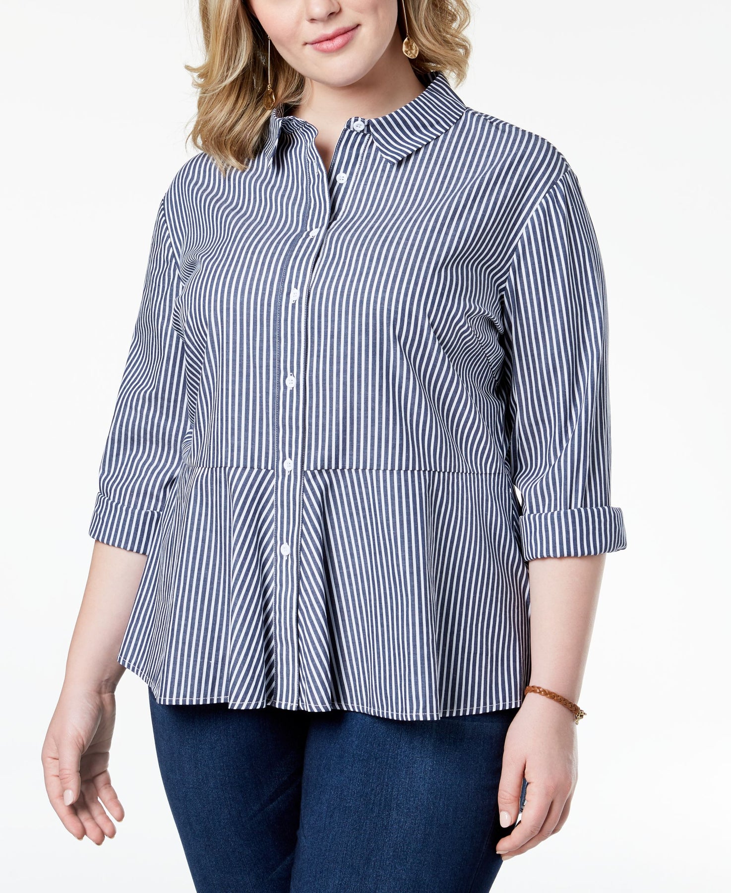 Say What Trendy Plus Size Cotton Striped Peplum Button Front Shirt