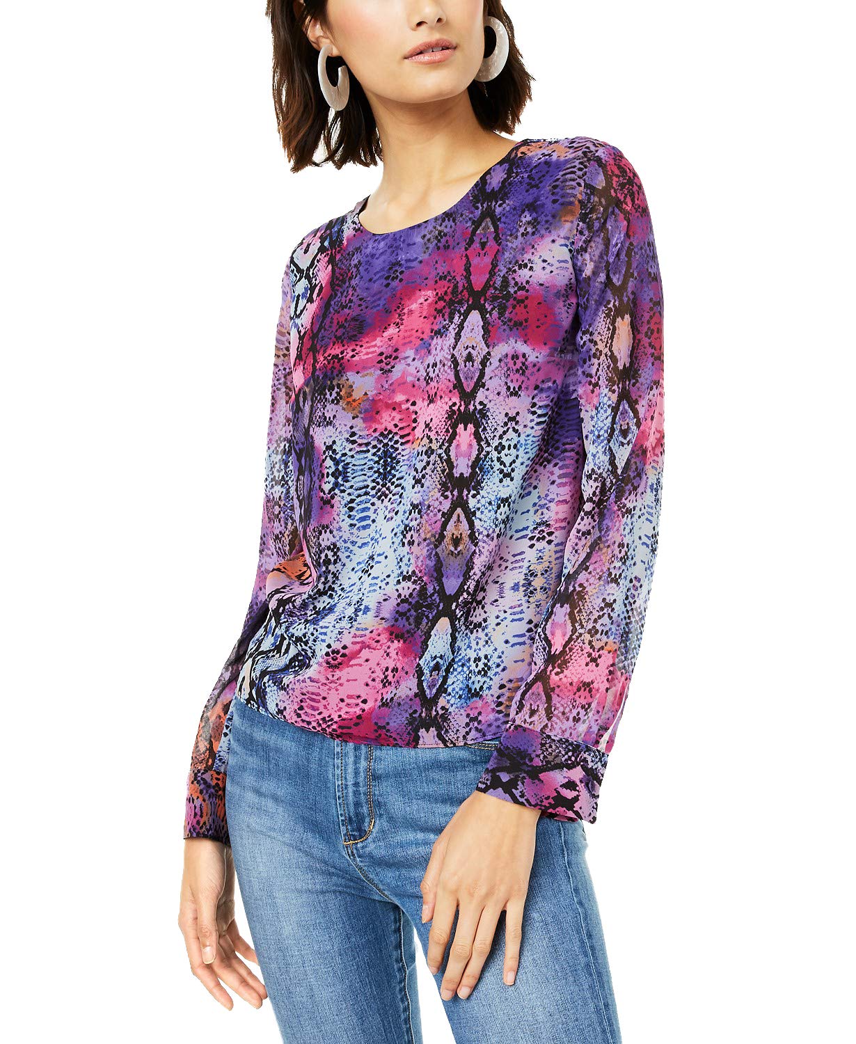 Wildly cute, Bar III's colorful snake-print blouse features a twist-back detail for an unexpected twist. Approx. model height is 5'10" and she is wearing a size M Relaxed fit; hits at high hip; approx. 23" Crewneck V-back with twist detail Cuffed long sleeves Shell: polyester; lining: polyester Machine washable Imported Web ID: 8534513