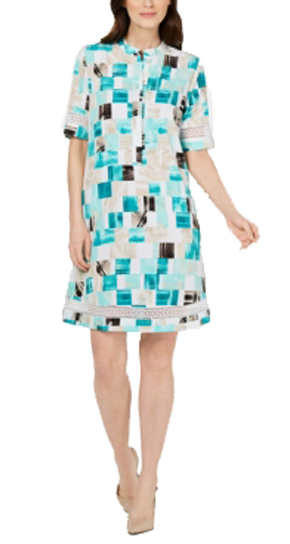 A graphic square pattern gives an artistic look to Alfani's printed dress, while crocheted trim at the hem adds an extra-special touch. Approx. model height is 5'10" and she is wearing a size small Approx. 36.5" long from center back neck to hem Split neckline; A-line silhouette Button-front closure Elbow-length sleeves Unlined Approx. model height is 5'10" and she is wearing a size S/4 Polyester Machine washable Imported Web ID: 8845986