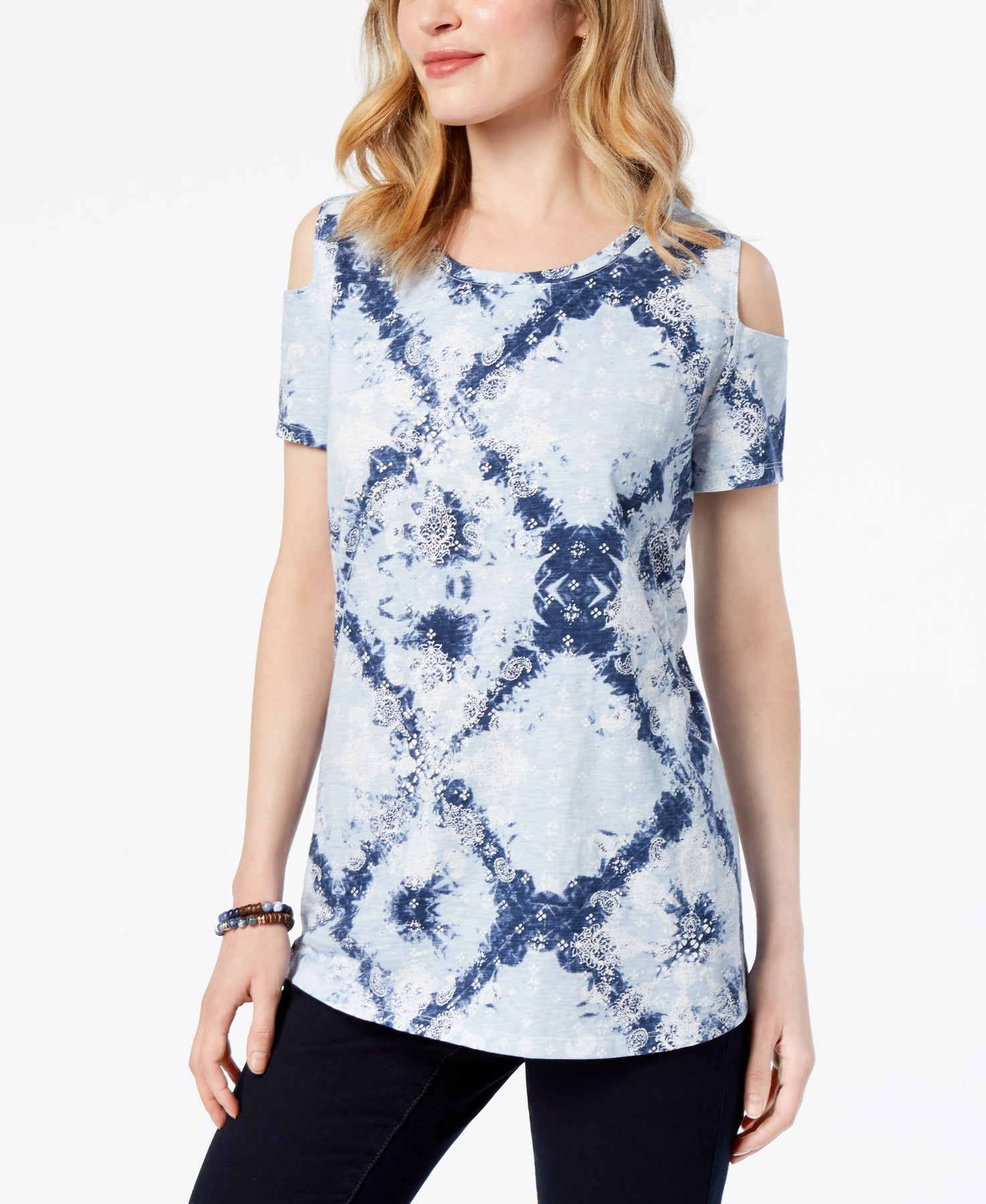 Rework your casual look in this printed T-shirt from Style & Co, a short-sleeve pick designed in cotton with cold-shoulder cutouts. Scoop neckline Approx. model measurements: height: 5'10"; bust: 35-1/2"; waist: 27"; hips: 35" Cold-shoulder cutouts Relaxed fit; hits at hip Due to generous sizing, we suggest sizing down for the perfect fit Cotton Machine washable Imported