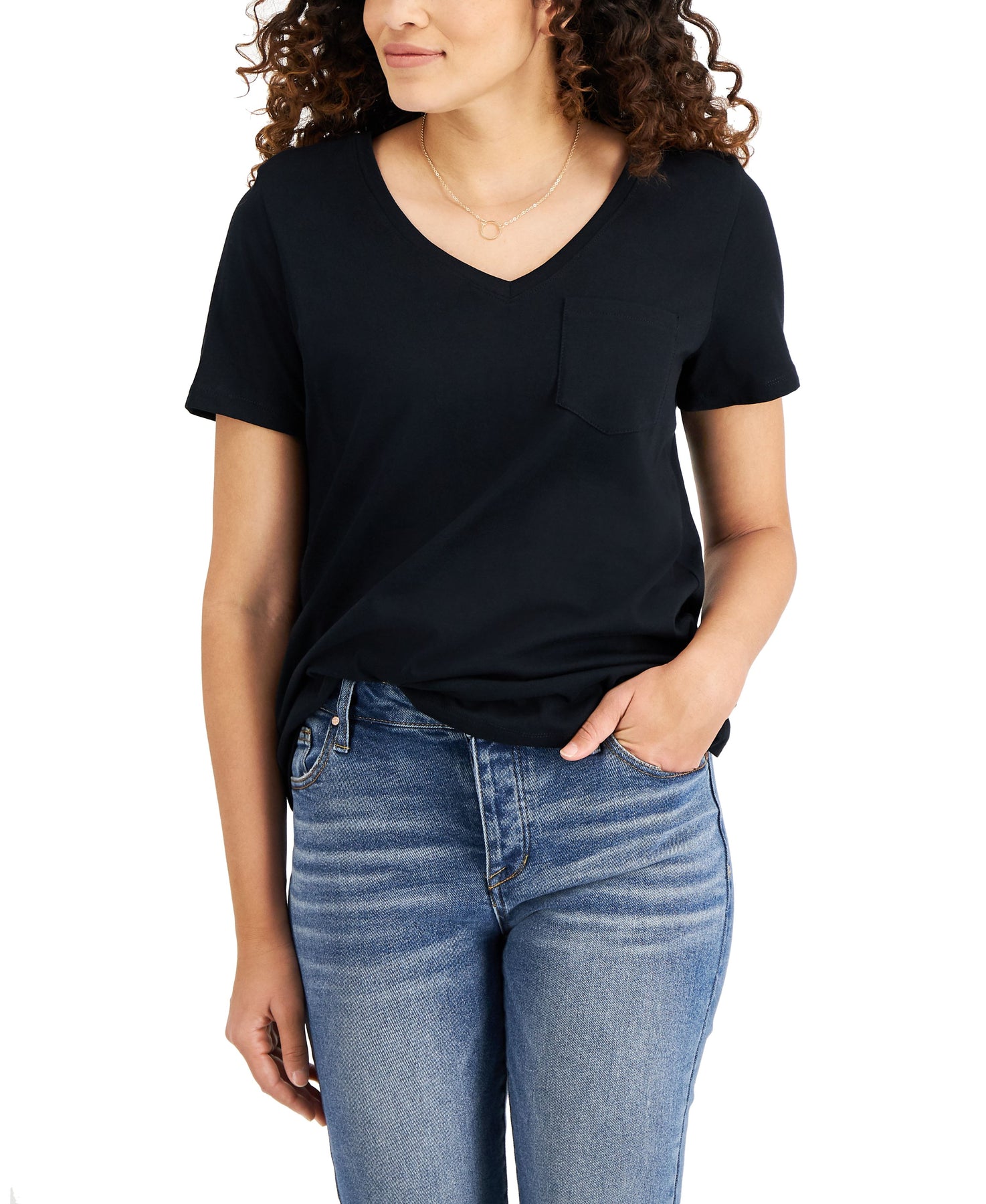 A single patch pocket and classic V-neck come together effortlessly on this cotton T-shirt from Style & Co. Approx. model height is 5'10" and she is wearing a size small V-neck Patch pocket at chest All cotton Machine washable Imported Web ID: 13269522