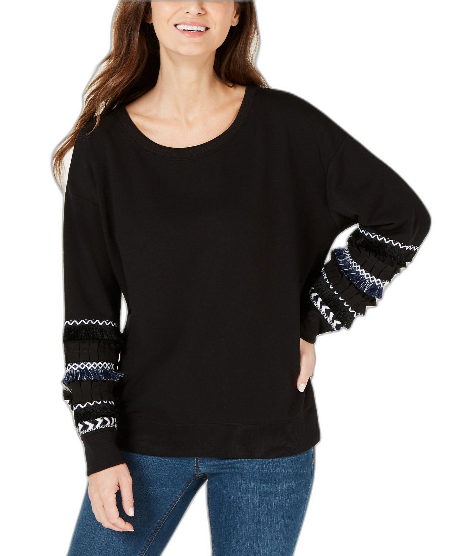 Choose the unconventional in Style & Co's oversized sweatshirt detailed with variegated bands of fringe from elbow to wrist. Approx. model height is 5'10" and she is wearing a size small Relaxed fit; hits at hip; approx. 26" long Due to generous sizing, we suggest sizing down for the perfect fit Crew neckline Long drop shoulder sleeves with embroidered bands of fringe Cotton/polyester/spandex; trim: polyester Machine washable Imported