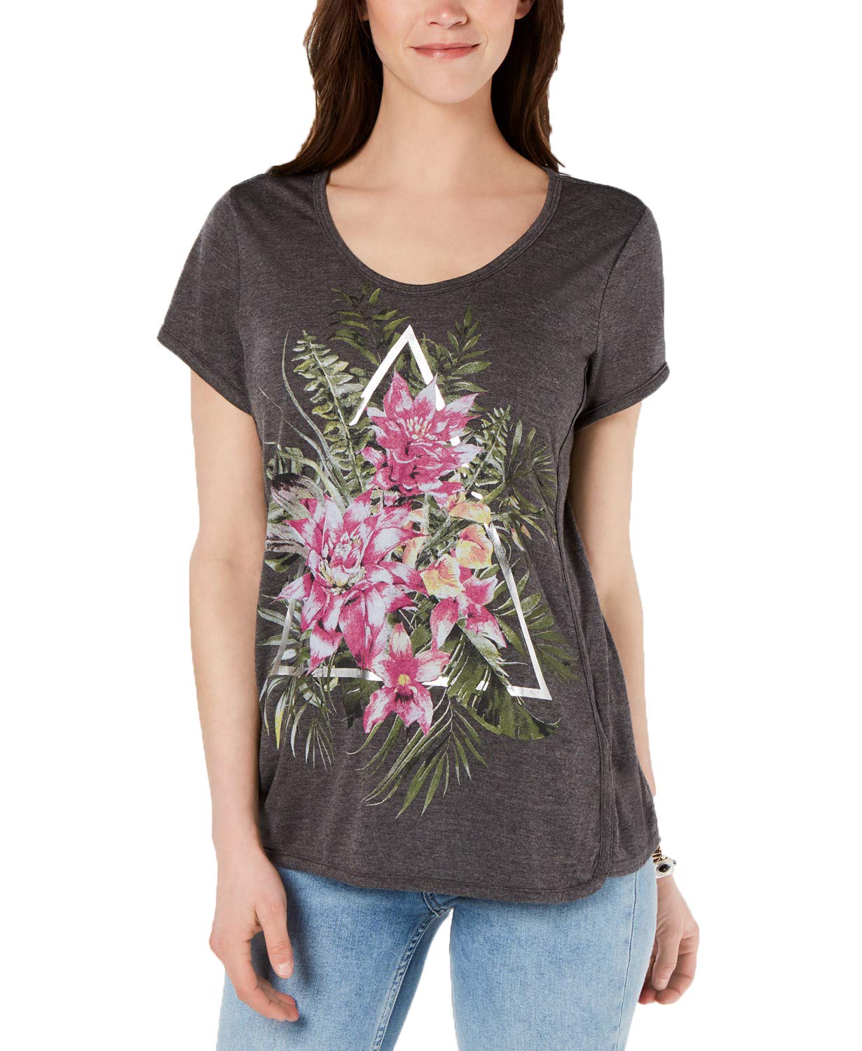 A cluster of beautifully blooming flowers highlights the front of this graphic-print T-shirt from Style & Co. Approx. model height is 5'10" and she is wearing a size small Relaxed fit; hits at hip Due to generous sizing, we suggest sizing down for the perfect fit Scoop neckline Graphic print at front Polyester/rayon Machine washable Imported