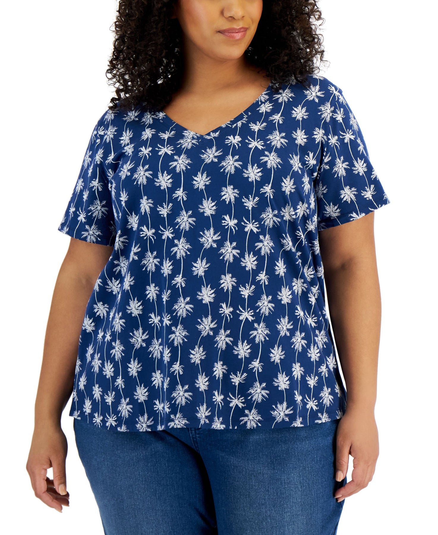 A relaxed shape in refreshing printed cotton knit, Style & Co's plus size top delivers a smart update to a casual wardrobe. Approx. model height is 5'10" and she is wearing size 2X Relaxed fit; approx. 27-1/2" long V-neck 100% cotton Machine washable Imported Web ID: 13852776