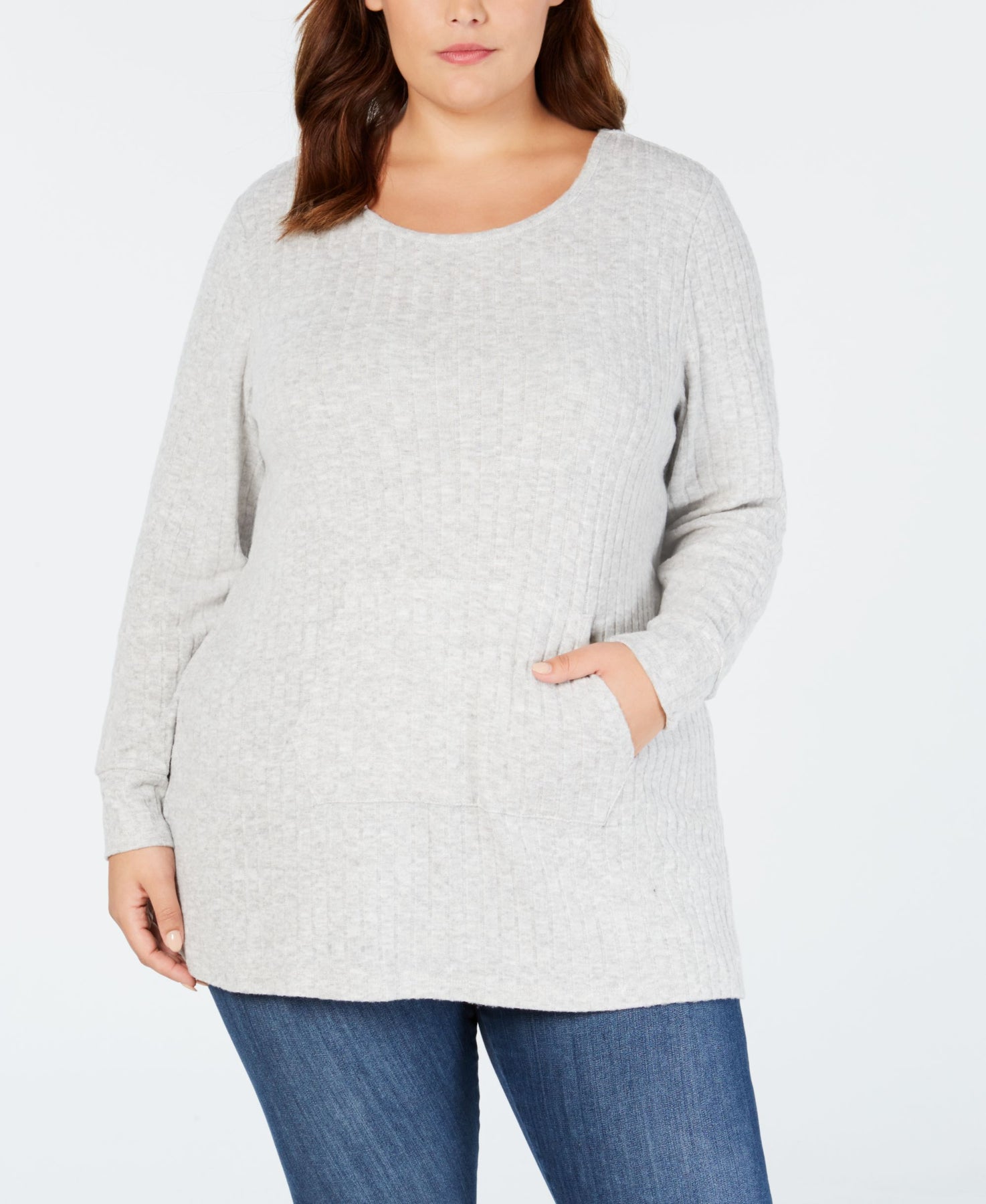 A fun addition to your casual collection, this plus size sweater from Style & Co accents ribbed knit with a kangaroo pocket. Vents at the hem add a flattering finish to the relaxed fit. Approx. model height is 5'10" and she is wearing a size 1X Relaxed fit; hits at hip with vents at the hem; approx. 31" long Scoop neckline Kangaroo pocket Polyester/rayon/spandex Hand Wash Imported