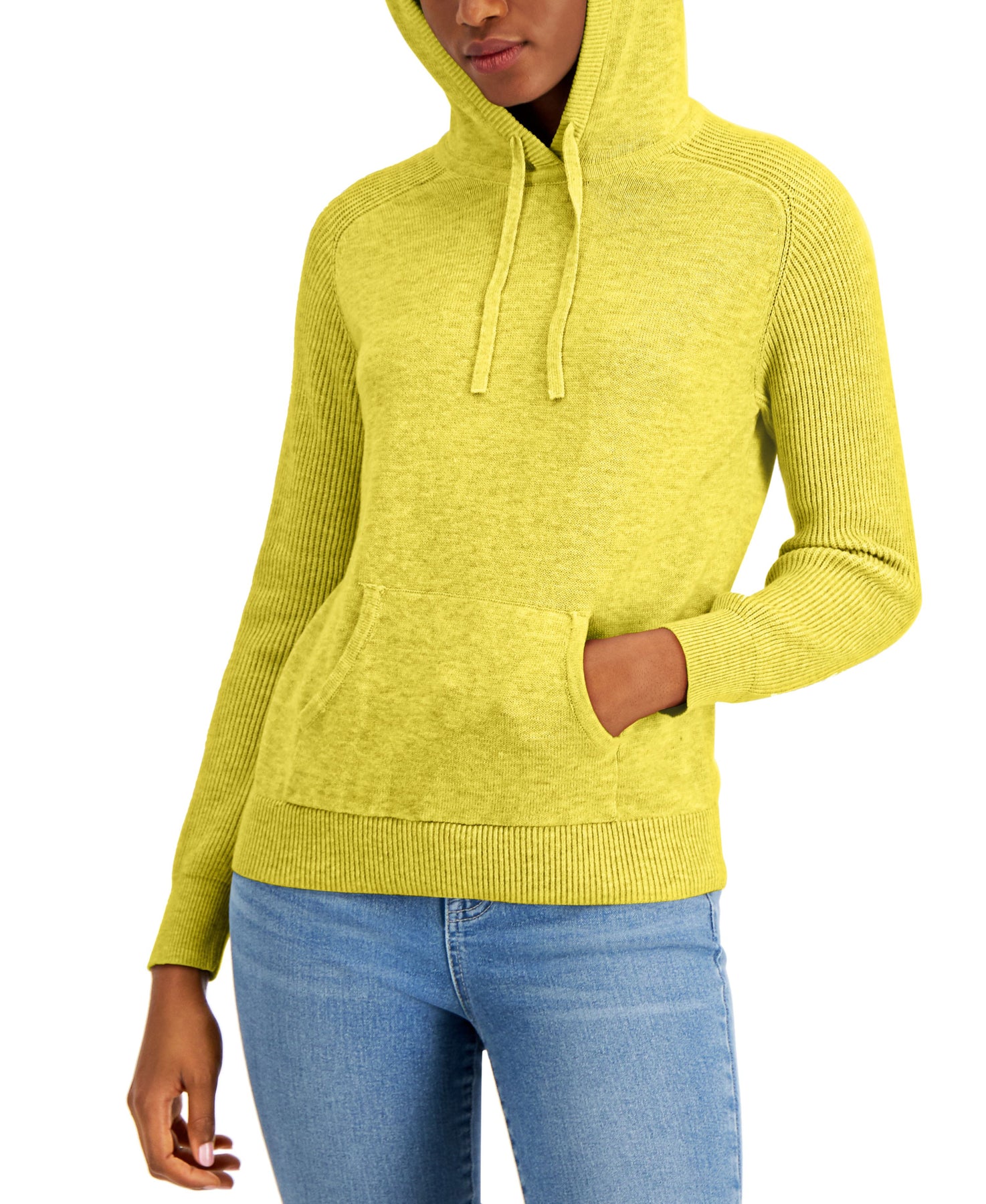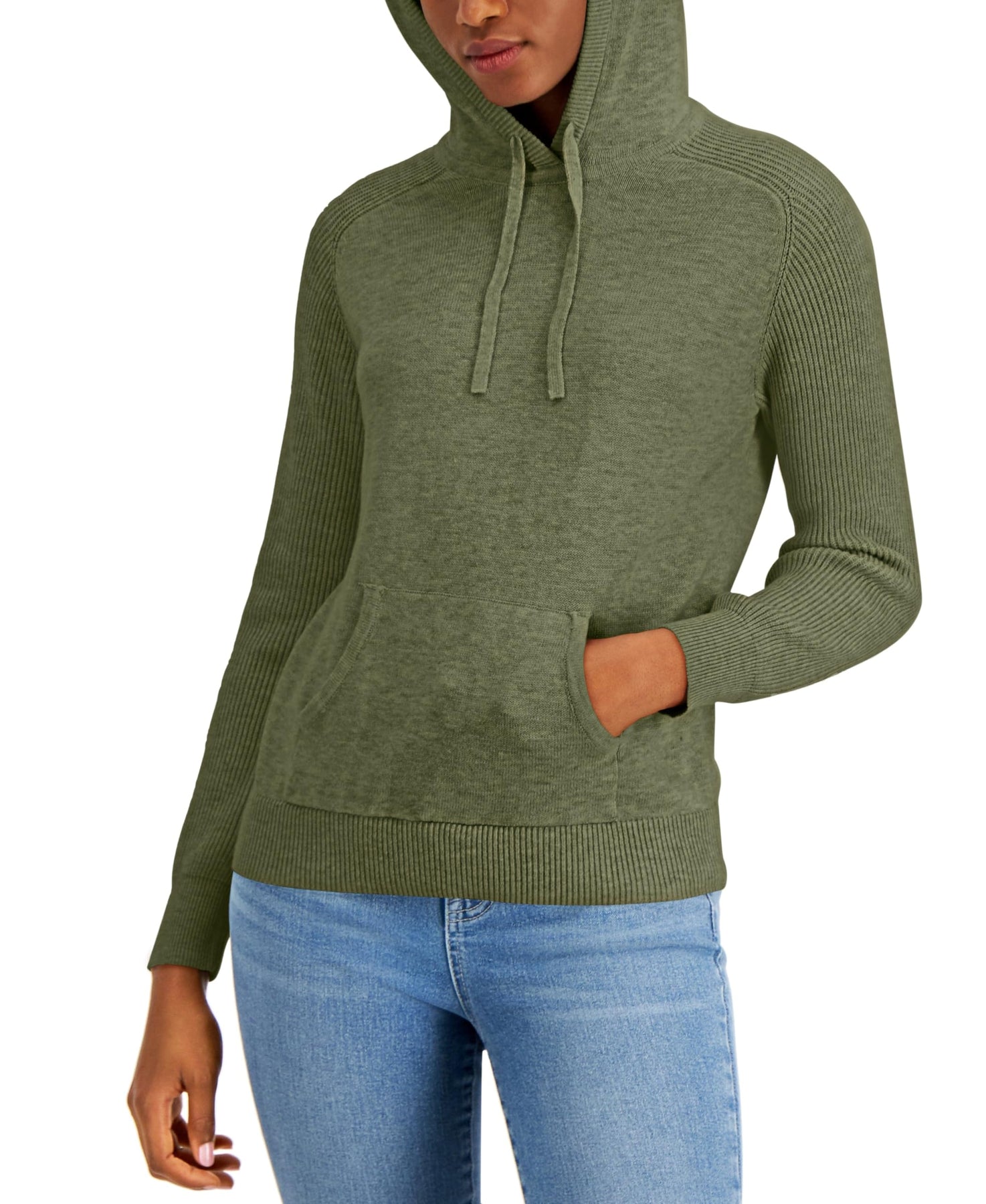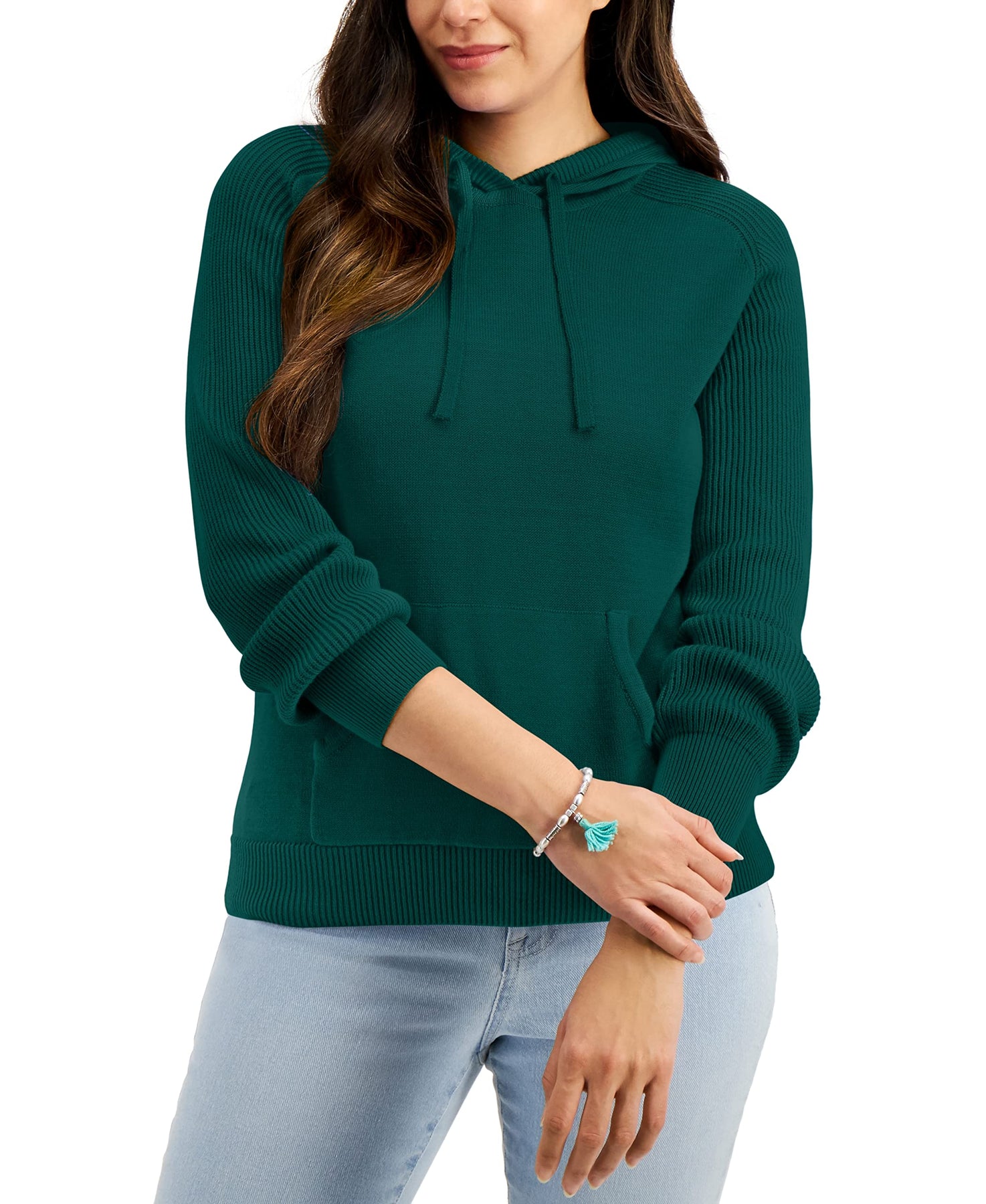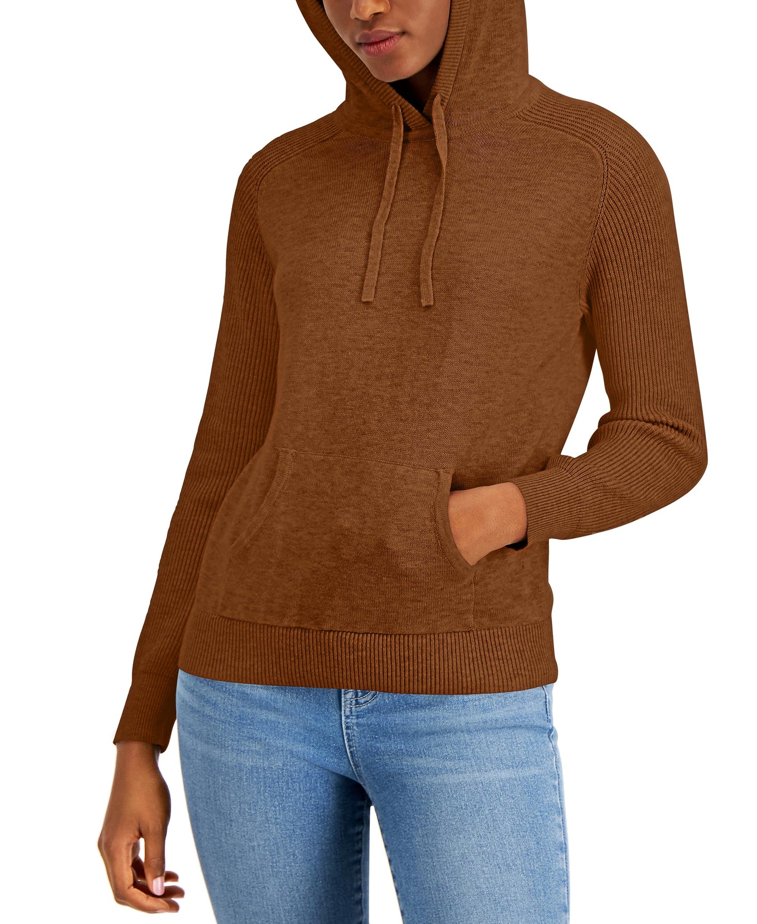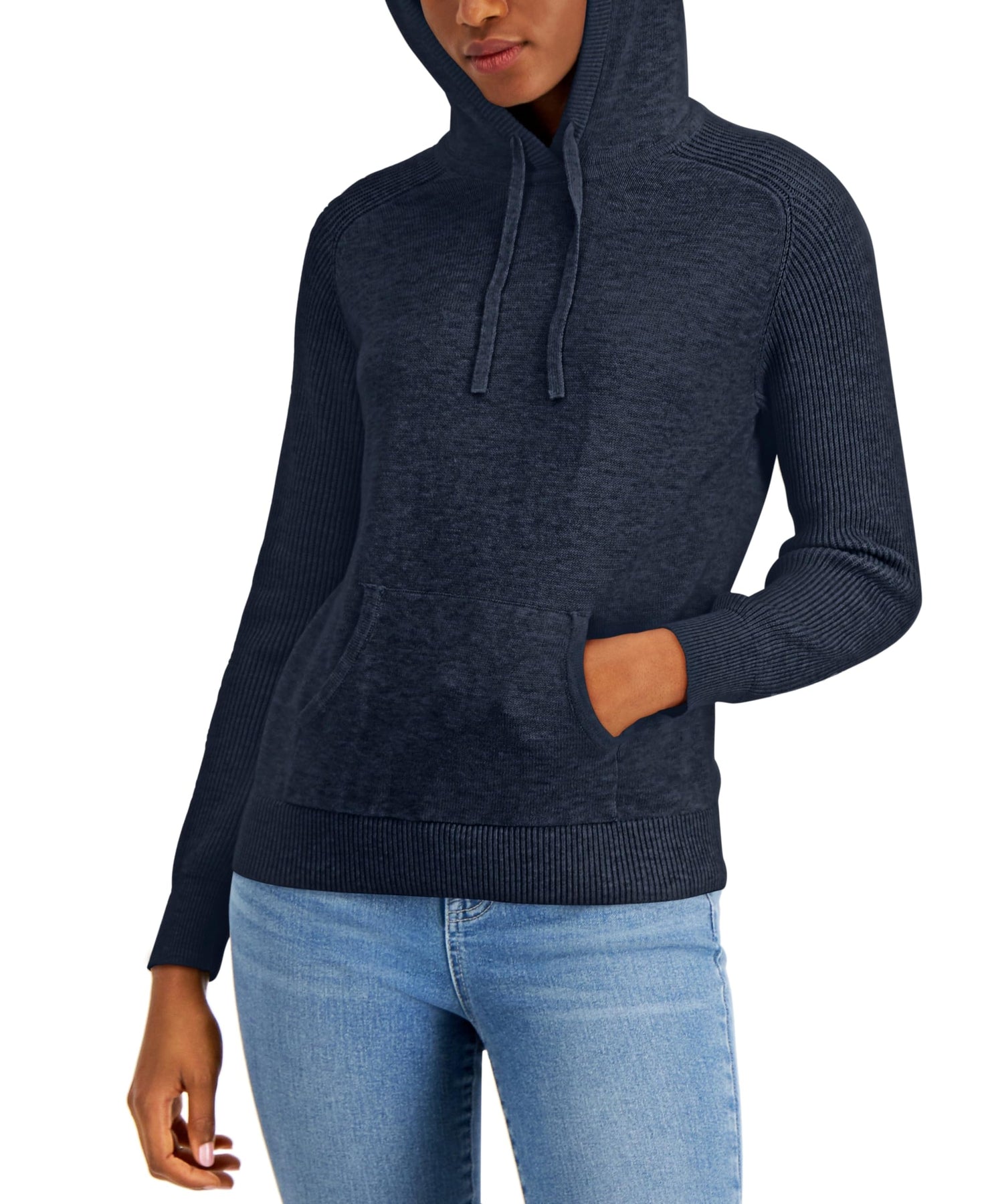 Warm up in style in this drawstring sweater hoodie from Style & Co, with a handy kangaroo pocket at the waist. Approx. 23-1/2" long Due to generous sizing, we suggest sizing down for the perfect fit Crewneck with attached drawstring hood Kangaroo pocket at front Cotton/rayon/nylon Machine washable Imported Web ID: 11296415