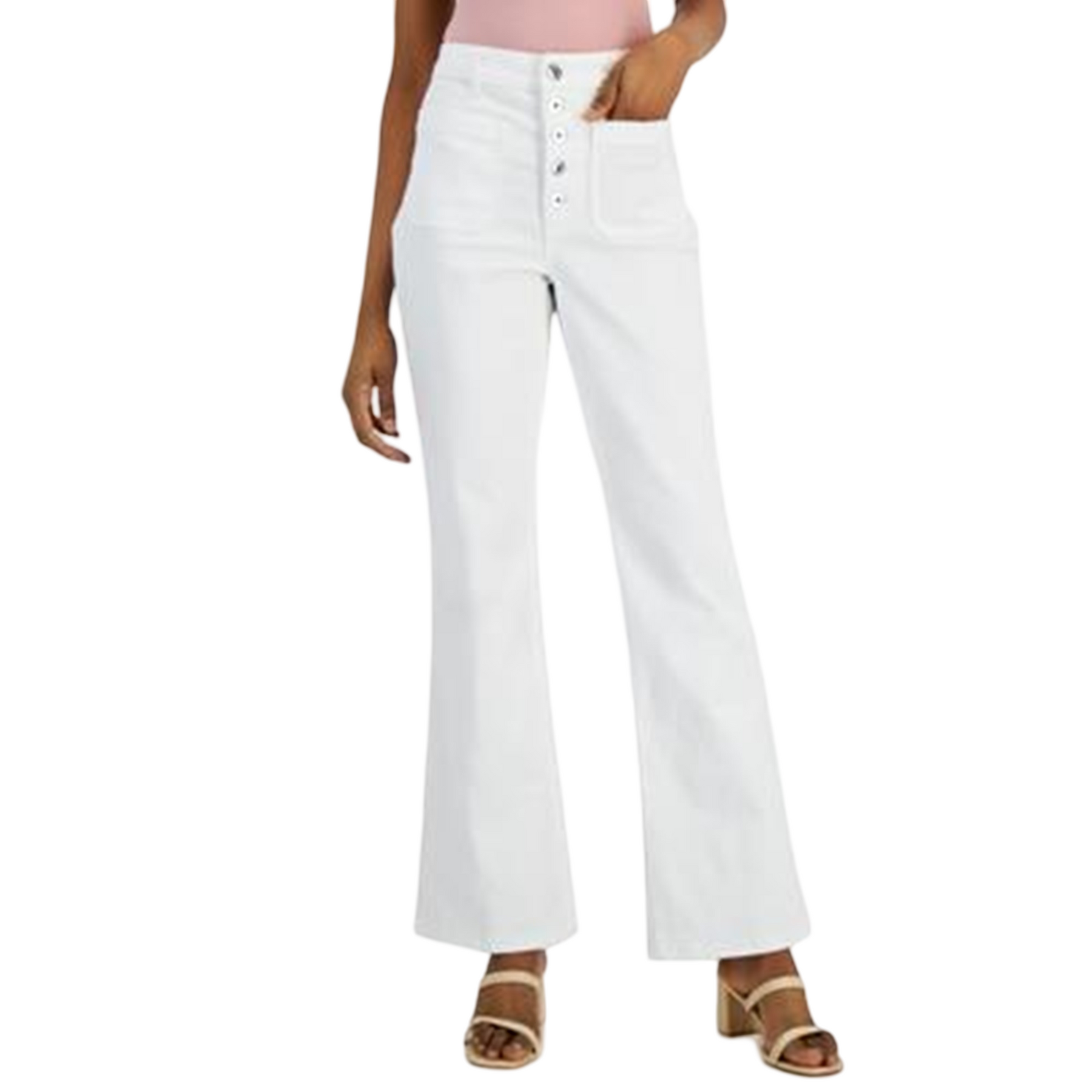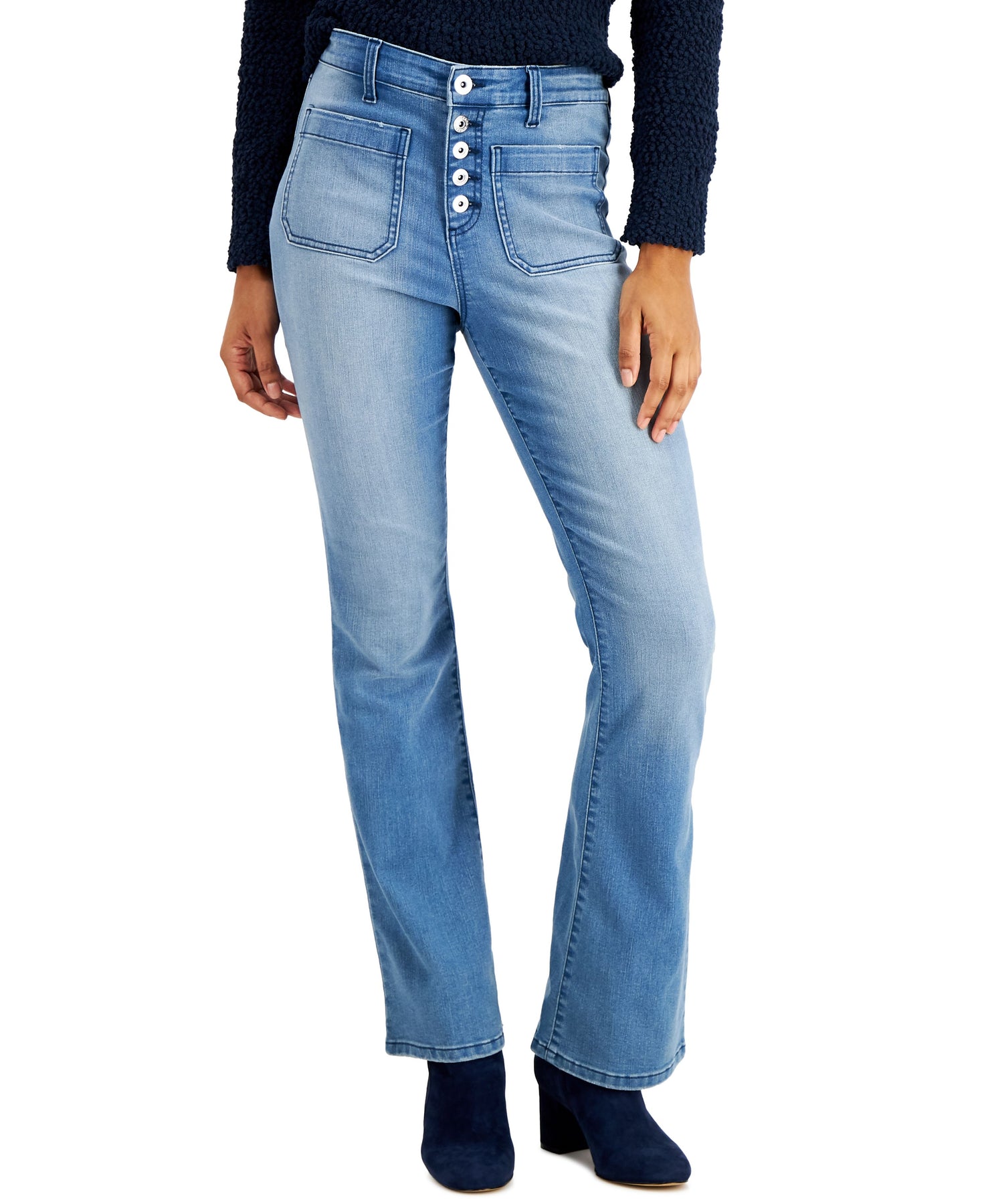 Retro-inspired details like a button fly and boot-cut leg turn up the style on these high-rise jeans from Style & Co. A high rise gives you a classic look and feel. Approx. inseam: 30-1/2" High rise Button closure; belt loops Patch pockets at front, back Cotton (100% recycled)/polyester/viscose/elastane Machine washable Imported