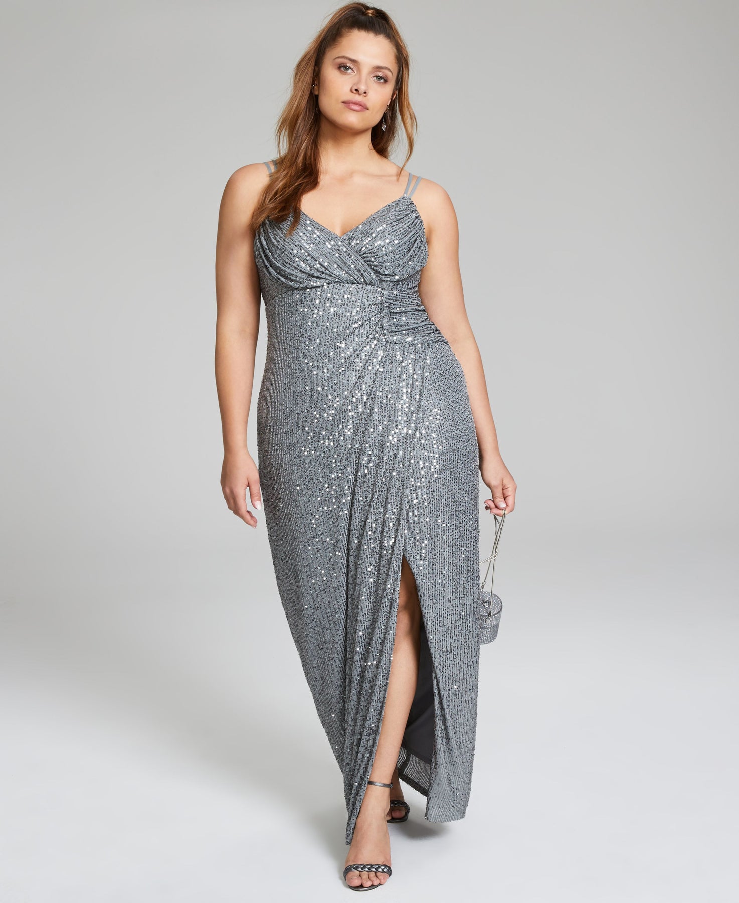 Trendy City Studios Juniors Plus Size Ruched Metallic Gown.