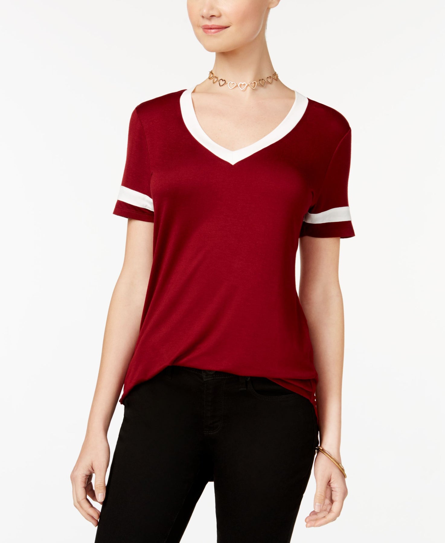 Get game-ready in this fun T-shirt from Ultra Flirt, styled with a V-neckline, short sleeves and a high-low hem. Short sleeve Hits at hip V-neckline High-low hem Cotton Blend
