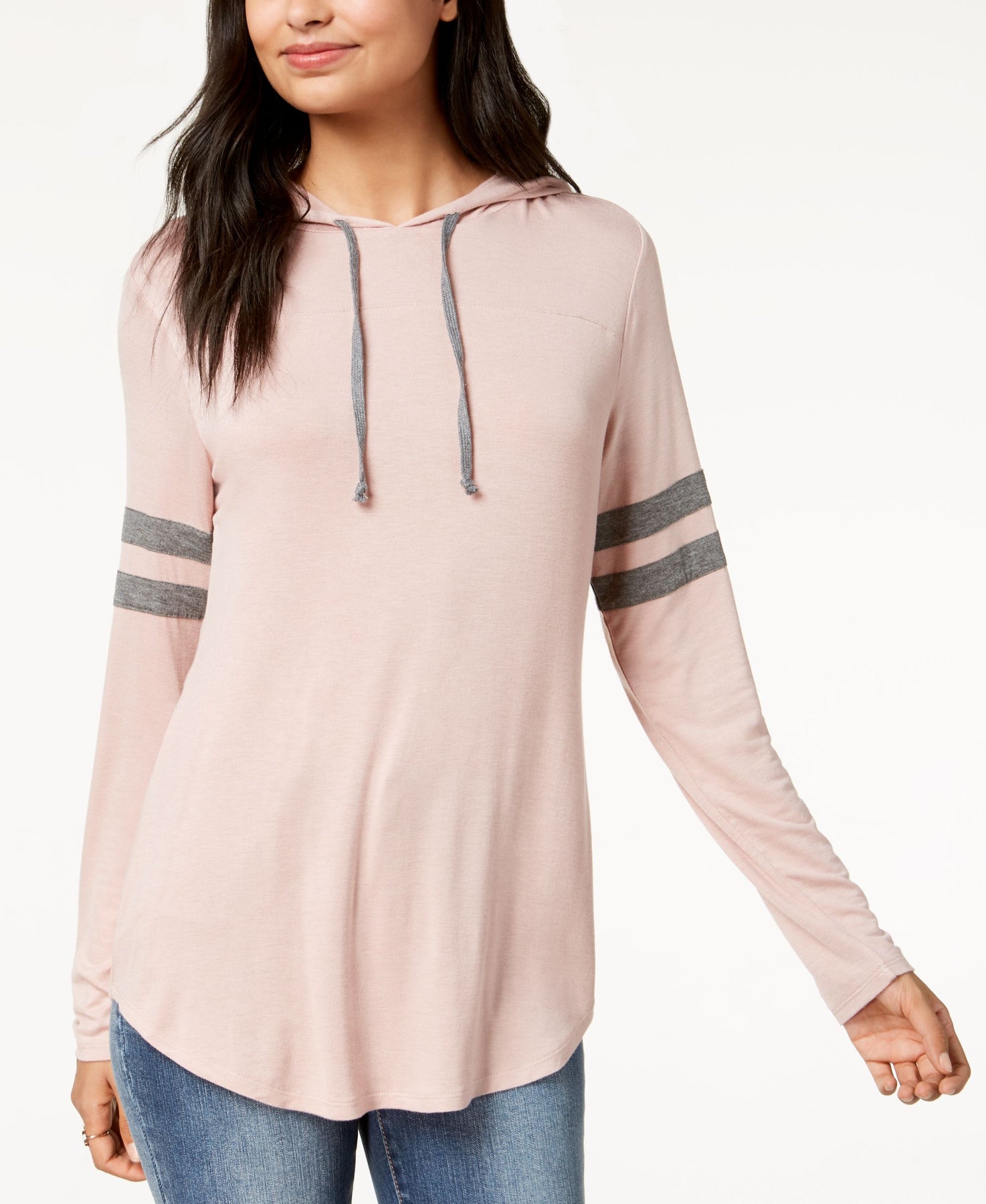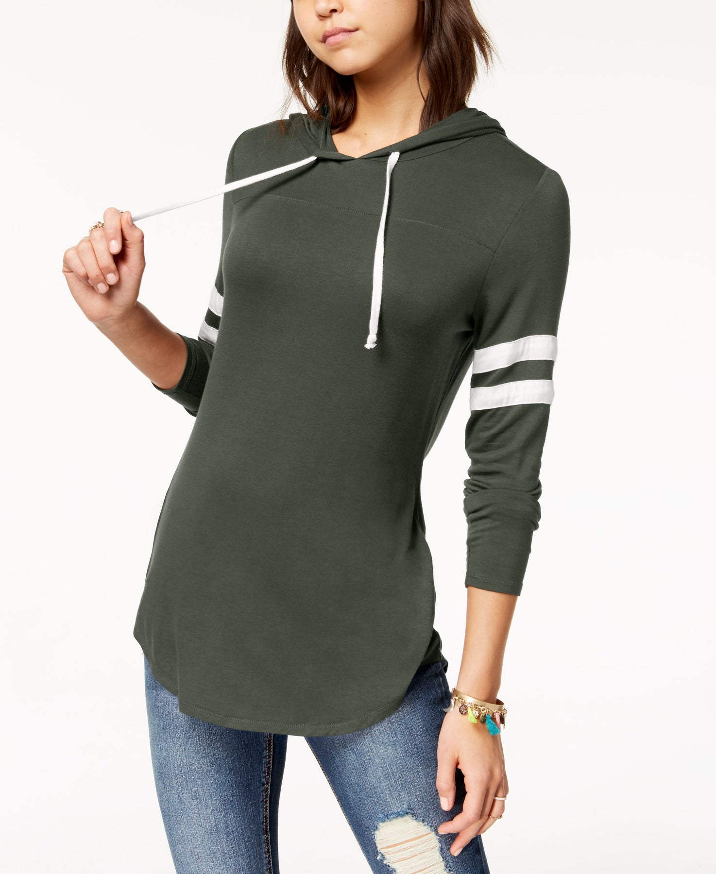 You'll look sporty-chic when you rock this varsity-style top from Ultra Flirt. Its drawstring hood adds a cozy element for snuggling up on the bleachers. Attached hood with drawstring Approx. model measurements: Height: 5' 9-1/2"; Bust: 32"; Waist: 25"; Hips: 34" Stripes at sleeves Easy fit; hits at hip Rayon/spandex Machine washable Imported