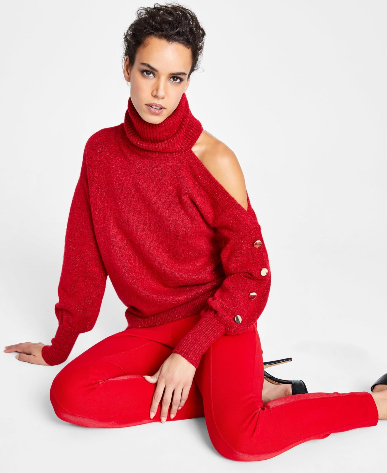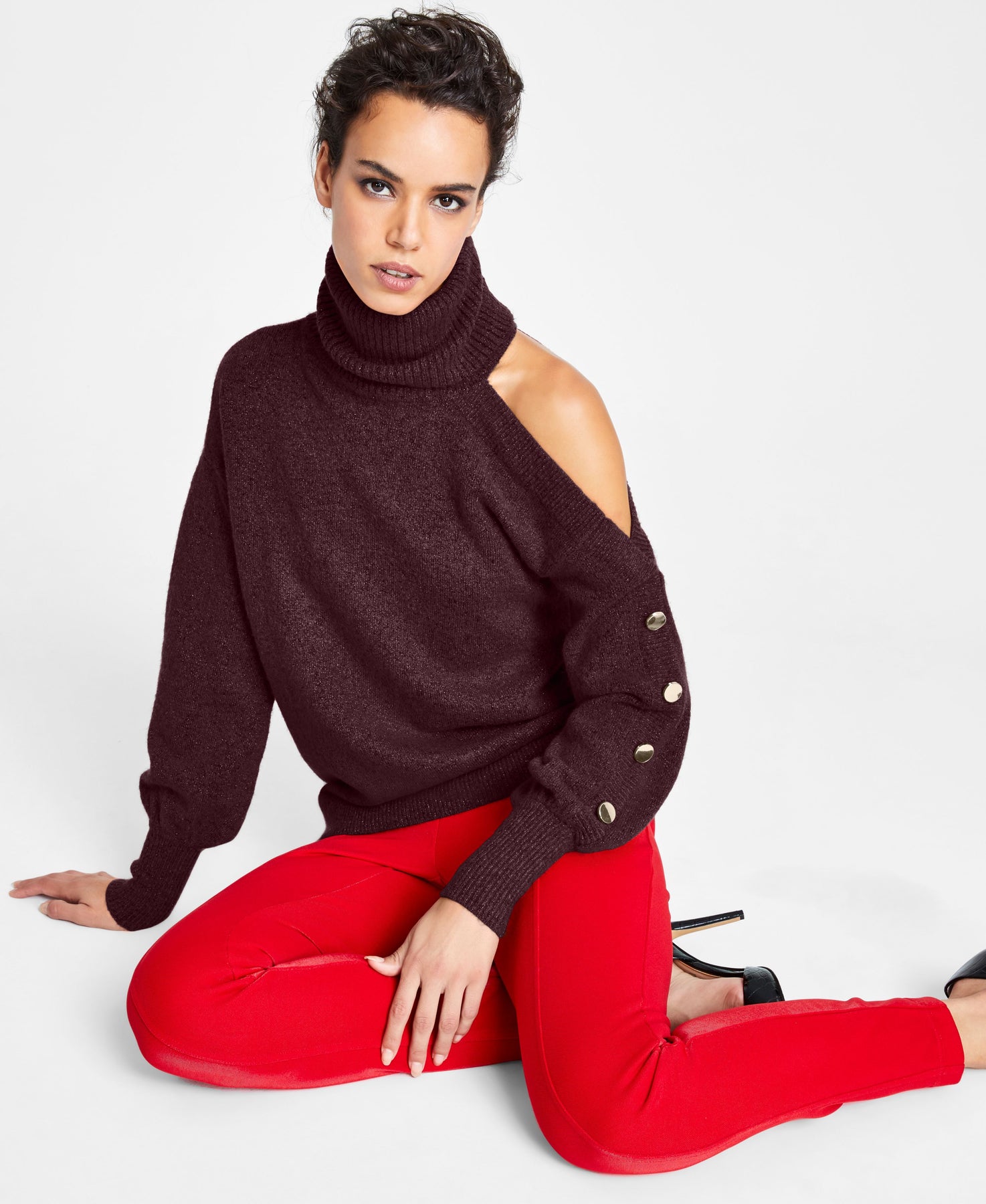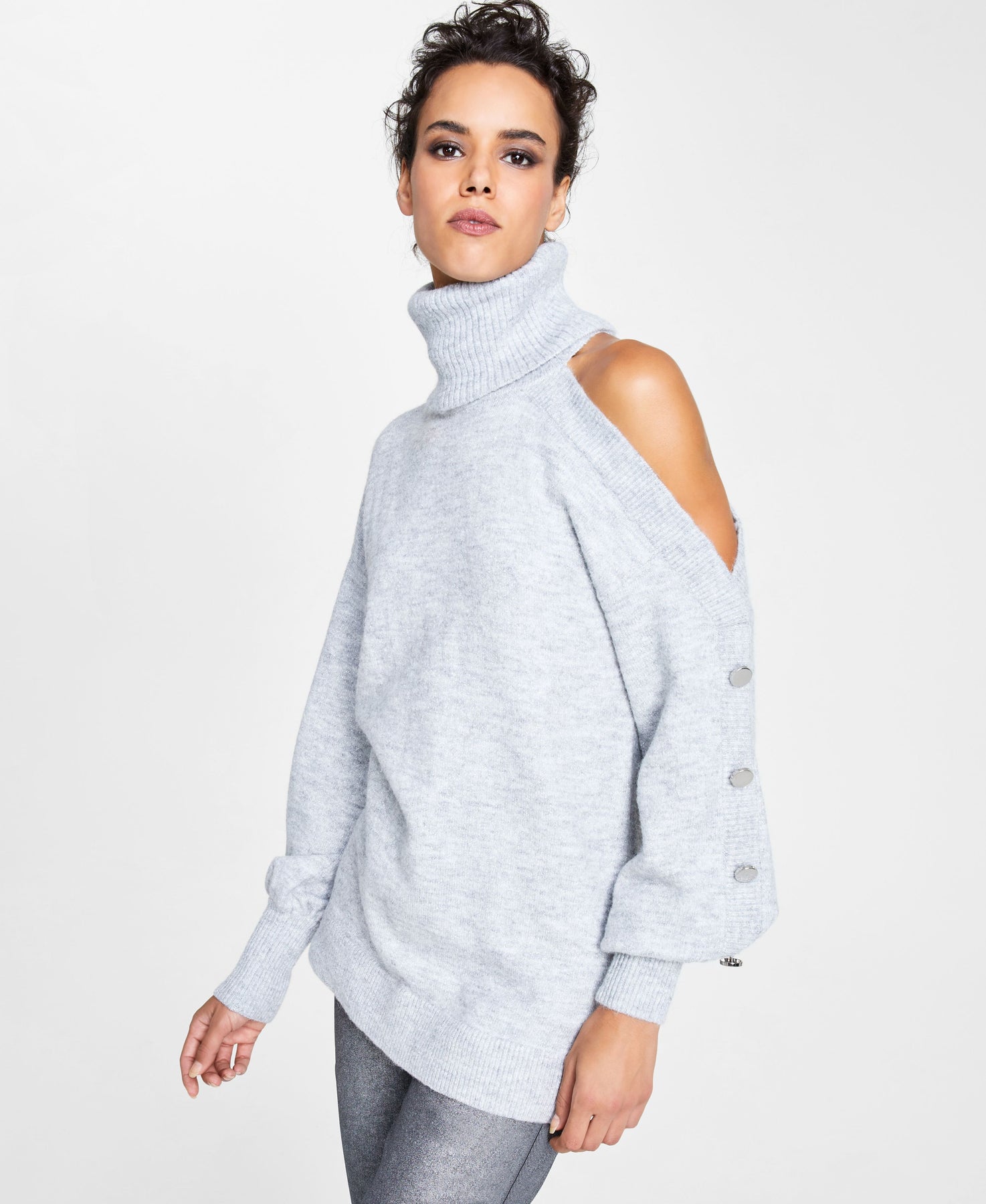 INC International Concepts adds a chic twist to your cold weather options with this asymmetrical turtleneck sweater featuring an eye-catching cold-shoulder sleeve with button detail. Relaxed fit; hits at hip Turtleneck Asymmetrical cold-shoulder long sleeves with button detail INC brings runway inspiration to your every day. Shop the full collection to create a head-to-toe look that's truly your own Polyester/acrylic/nylon/metallic/spandex/wool Machine washable Imported Web ID: 12461373
