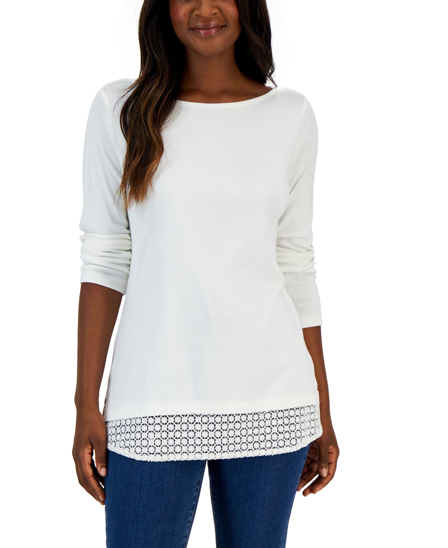 A lace trim lends charm to this women's top from Karen Scott, a versatile cool, all cotton addition to any closet. Approx. model height is 5'10" and she is wearing a size medium Approx. 28-1/2" long Due to generous sizing, we suggest sizing down for the perfect fit Boat neckline Lace trim at hem This garment was made in a factory where RISE programs advance women's empowerment and gender equality By choosing cotton products from this brand, you're supporting investment in Better Cotton's mission. This product is sourced via a system of mass balance and therefore may not contain Better Cotton This product was made in a factory where RISE programs advance women's empowerment and gender equality All cotton Machine washable Imported Web ID: 14334847