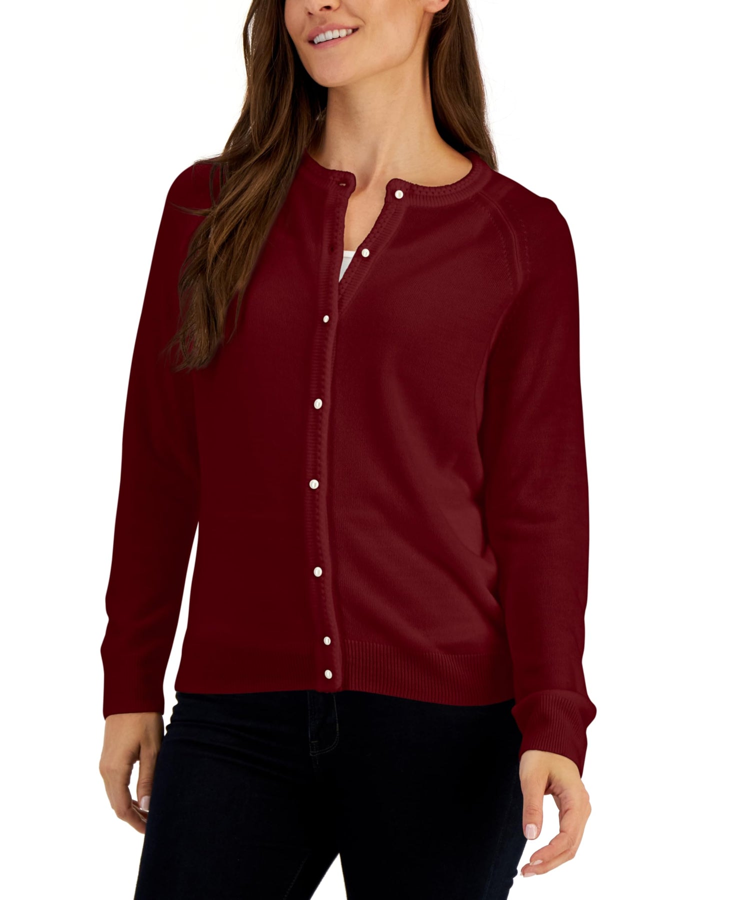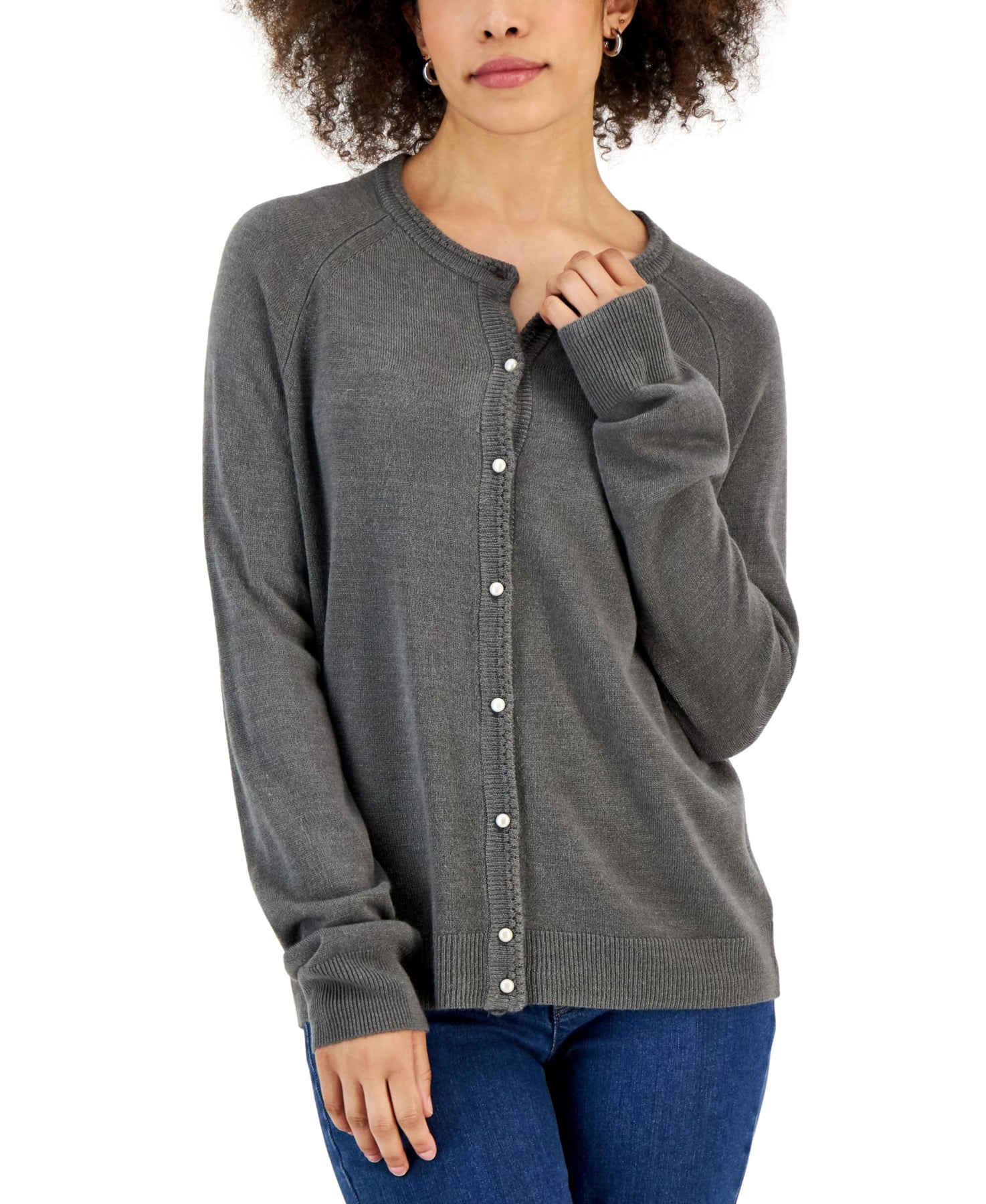 Karen Scott's luxe soft knit is back, here as a classic crewneck cardigan upgraded with pearlized buttons. Due to generous sizing, we suggest sizing down for the perfect fit Crewneck; pearlized button closures Luxe soft knit Acrylic Machine washable Imported Web ID: 14106866