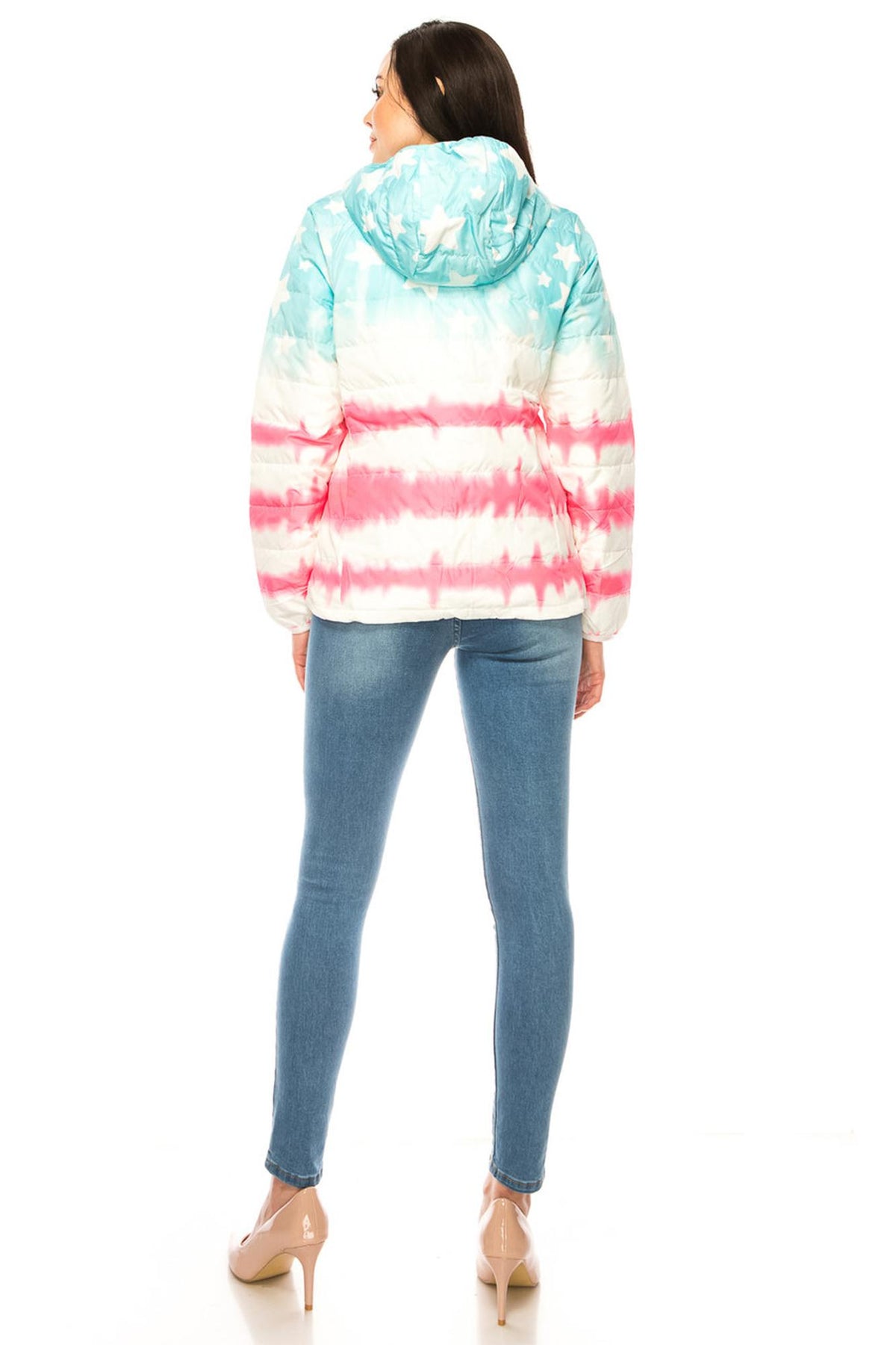 Introducing our Women's Pink & Blue Star Daub Winter Puffer Jacket, a patriotic blend of style and warmth. Stand out in the winter wonderland with a design that turns frosty days into a fashion spectacle. With a hood, tapered waist, and zipper pockets, this jacket offers both chic style and practical functionality, providing a cozy choice for even the coldest days.