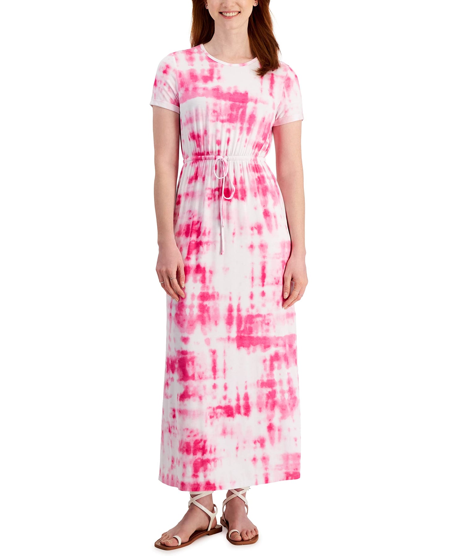 Polish your casual look in this easy dress from Style & Co, a maxi silhouette in vibrant tie-dyed tones. A drawstring waist lets you accent your shape. Approx. model height is 5'10" and she is wearing a size small Approx. 52" long from center back neck to hem Ankle-length or longer casual dress Jersey-knit: Soft and stretchy Crewneck Pullover styling Drawstring at waist XS=0-2, S=2-4, M=6-8, L=10-12, XL=14-16 Unlined Rayon/spandex Machine washable Imported Web ID: 13656657