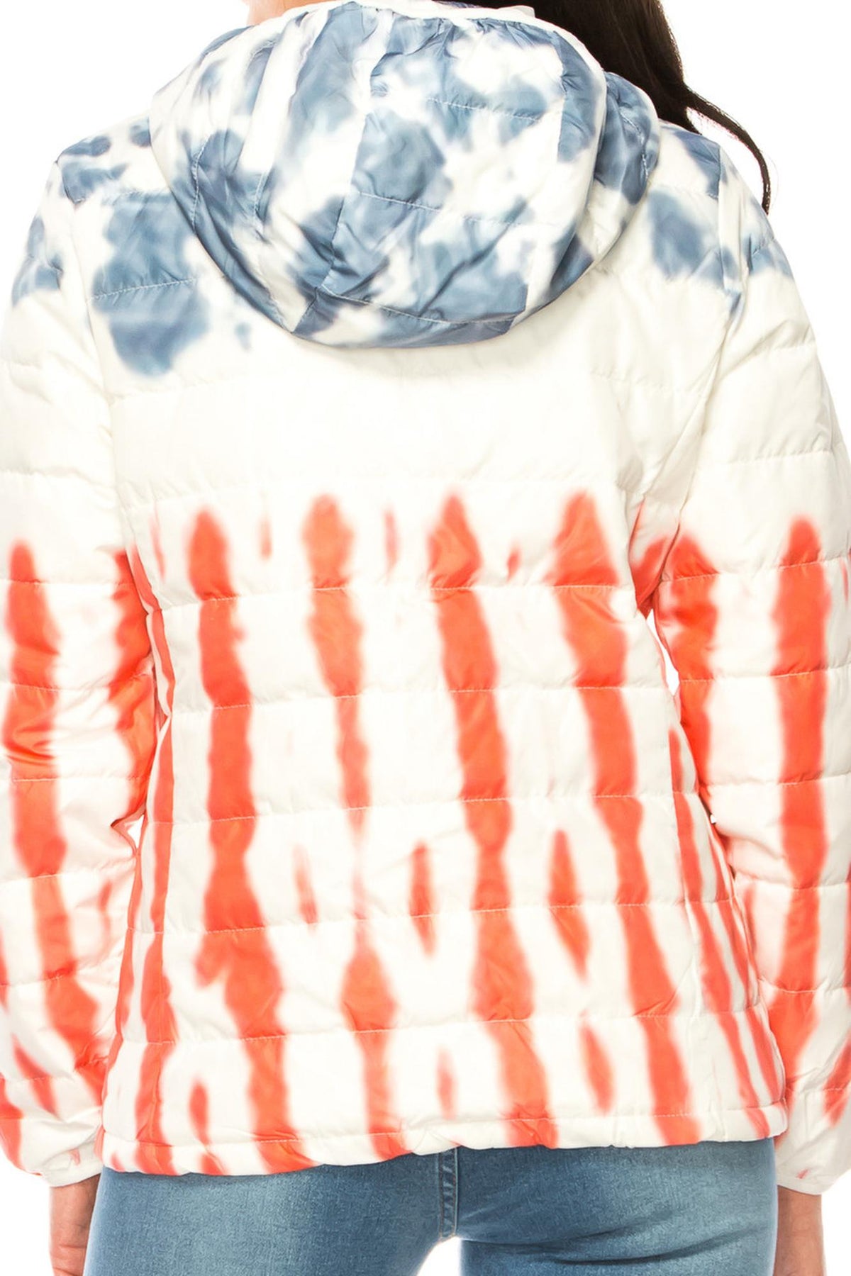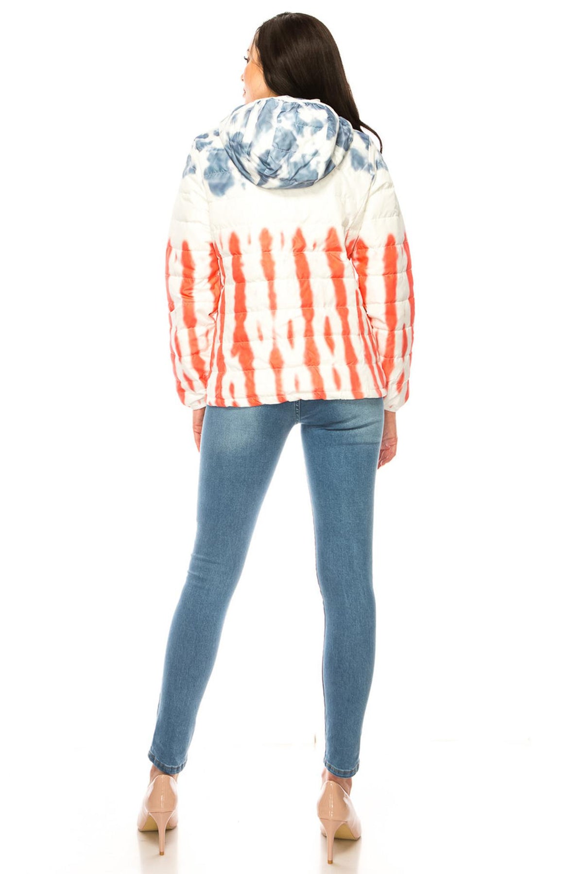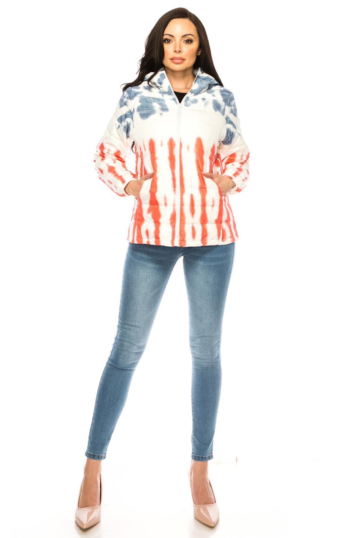 Introducing our Women's Red White & Blue Daub Winter Puffer Jacket, a cozy blend of patriotic style and warmth. Stand out with an abstract rendition of the American flag in vibrant tie-dye, making a bold statement for winter. With a hood, tapered waist, and zipper pockets, this jacket offers both chic style and practical functionality, ensuring you stay organized and cozy throughout chilly weather.